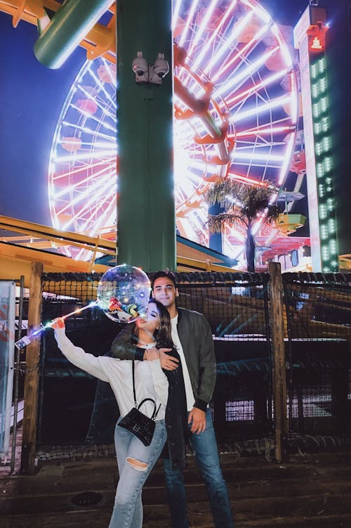 Hi, These are my requests: 1. Please center my girlfriend and me in the painting. 2. If you can remove the giant green pole (that is right behind us), the roller coaster (that's right behind us and in front of the Ferris wheel), and the fences behind us. I would like the Ferris wheel to be the main object behind us. You can put stores behind us under the Ferris wheel (whatever you think will look the best). Also, I would like to keep the NEON lights look. For reference, this is the Santa Monica Pier in California. Thank you!