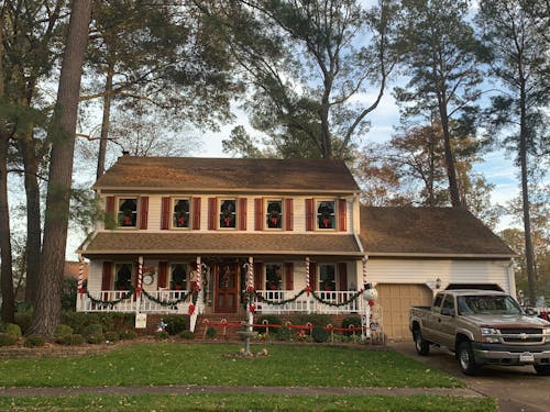 Please remove the truck, close the garage door, remove wreaths from windows, garland on the porch railings and all other Christmas decorations. I would like it as realistic as possible.