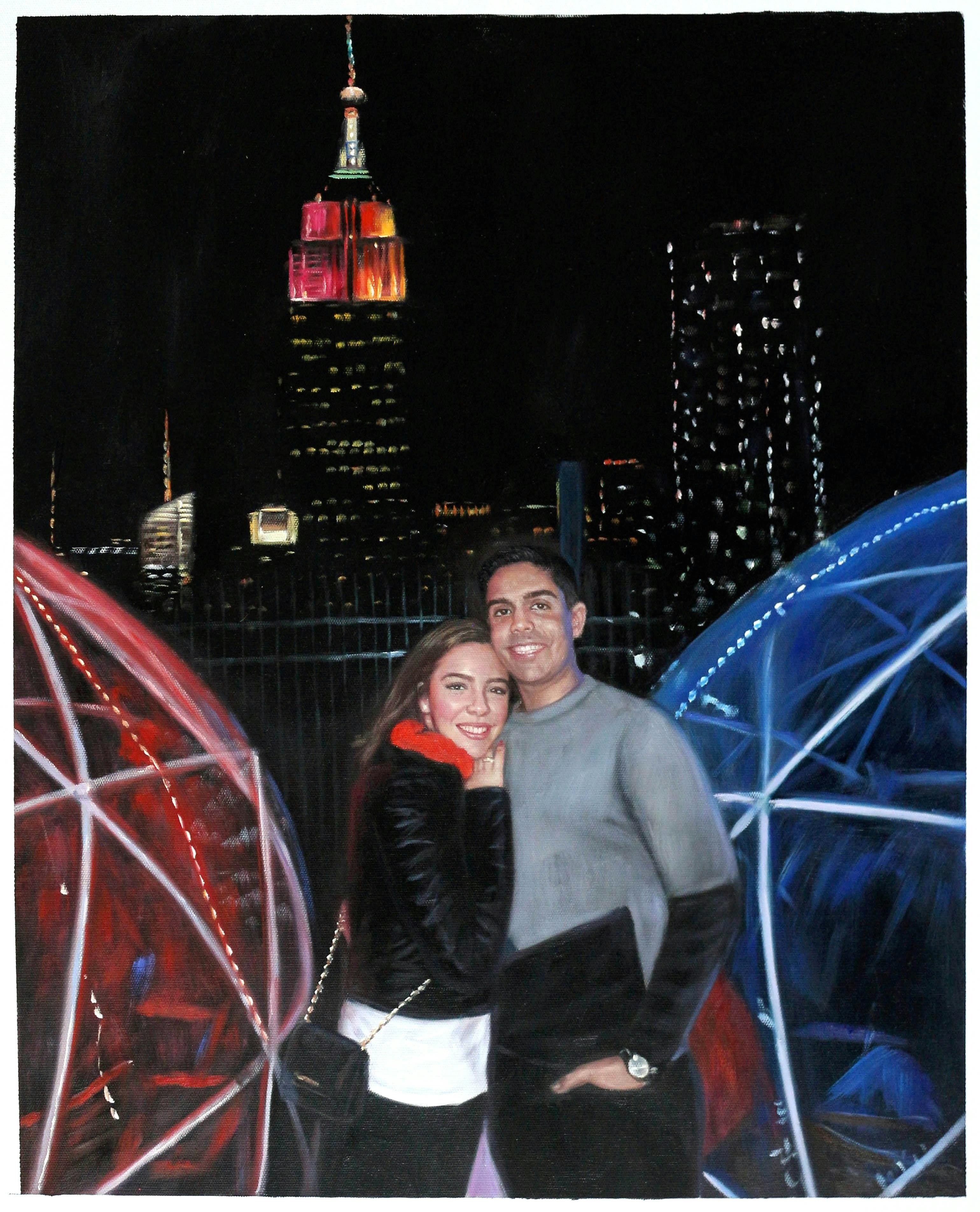 05/01/2018I would love to have this painted as depicted BUT as you can see, there are people inside the pink and blue light up igloos. Please paint the photo as depicted, but there is no need to paint the people inside the igloo. All we need for the painting are the two people, the NYC background and the light up igloos. I hope this makes the painting easier to complete, as I would love to have it before May 24th for a birthday gift! Thank you!