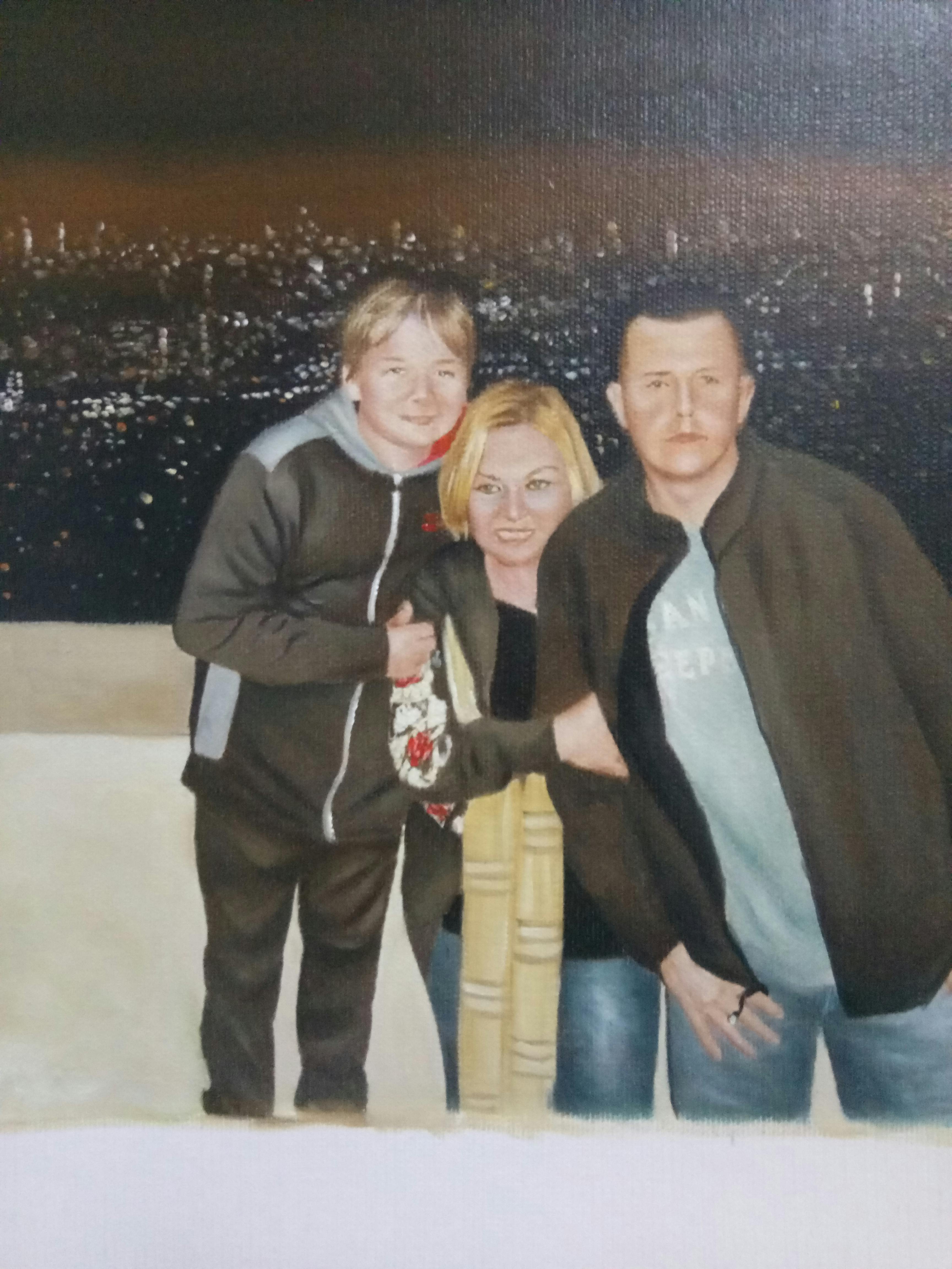 This is my 3rd painting this month and 4th overall. Thank you. Could you please try and leave out the building on the right and match it with the background of the lights from downtown Los Angeles? Please, please put a little smile on the man on the far right. Please make sure the beautiful mother in this photo has green eyes and even set eyes.Thank you and God bless you and your beautiful work. Happy Holidays to you and your family.661.310.4711