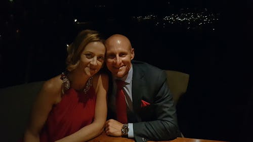 Try to center the couple in the painting please. Also, our spirit animals are a dolphin and a squid. If you could put a tiny dolphin emblem and squid emblem in the painting somewhere that are not obvious, that would be very special to us.