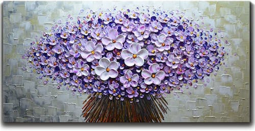 i love everything about the photo, but the only thing i would like the change is the background. leaving in the bench that they’re sitting on is fine, but everything behind that i would love to be a sort of collage of shades of purples and white flowers. i included a reference photo for that, but i just want it to be of the petals and not of the whole flower arrangement. i also really love how textured they look, so if that’s possible i would love to do that, even for the whole painting.