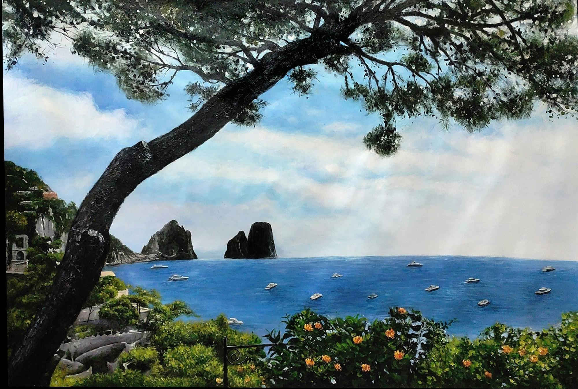 I am not looking just for a print of this picture , please give to the painting your touch , this picture was taken in Capri . I think some more flowers in the green and to see the entire tree would be great ( in the picture the upper side is cut) Thank you so much !