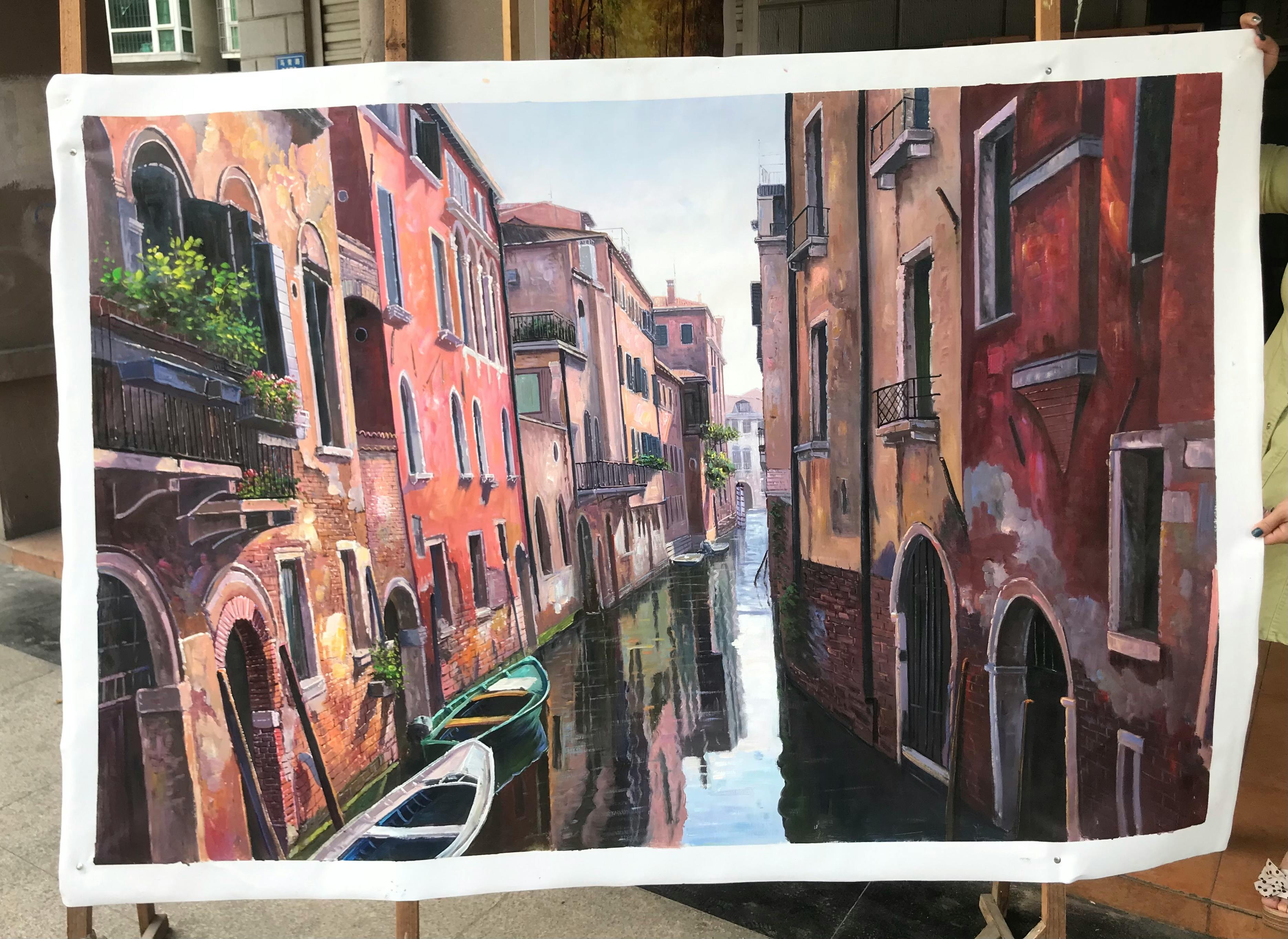 Painting is absolutely beautiful and we love it! It was completed very quickly as well. Unfortunately the box was quite damaged during shipping but we’re hoping the resulting crease in the painting will be stretched out successfully when mounted