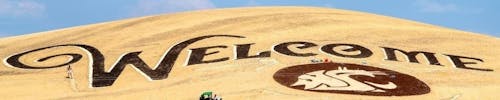 The picture of the university, but the hills are are covered in wheat. The welcome text carved into one of the hills in the foreground. I was thinking the one circled in red, but whatever you think looks best.
