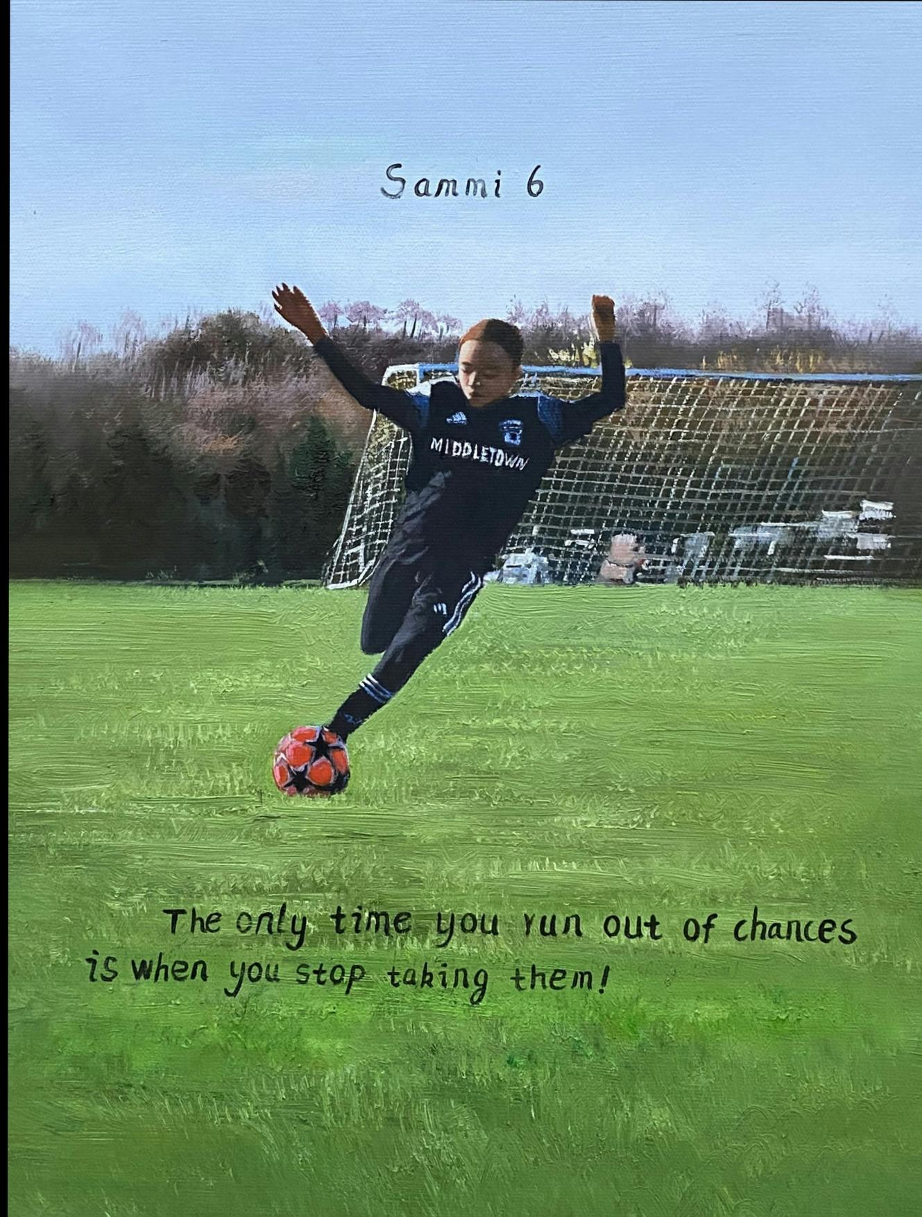 I’d like the name and # of the player to be added to the bottom of the painting “Sammi” “6”. Also would like a quote at the bottom of the painting “The only time you run out of chances is when you stop taking them”