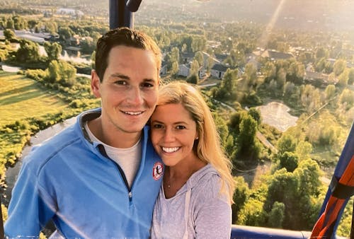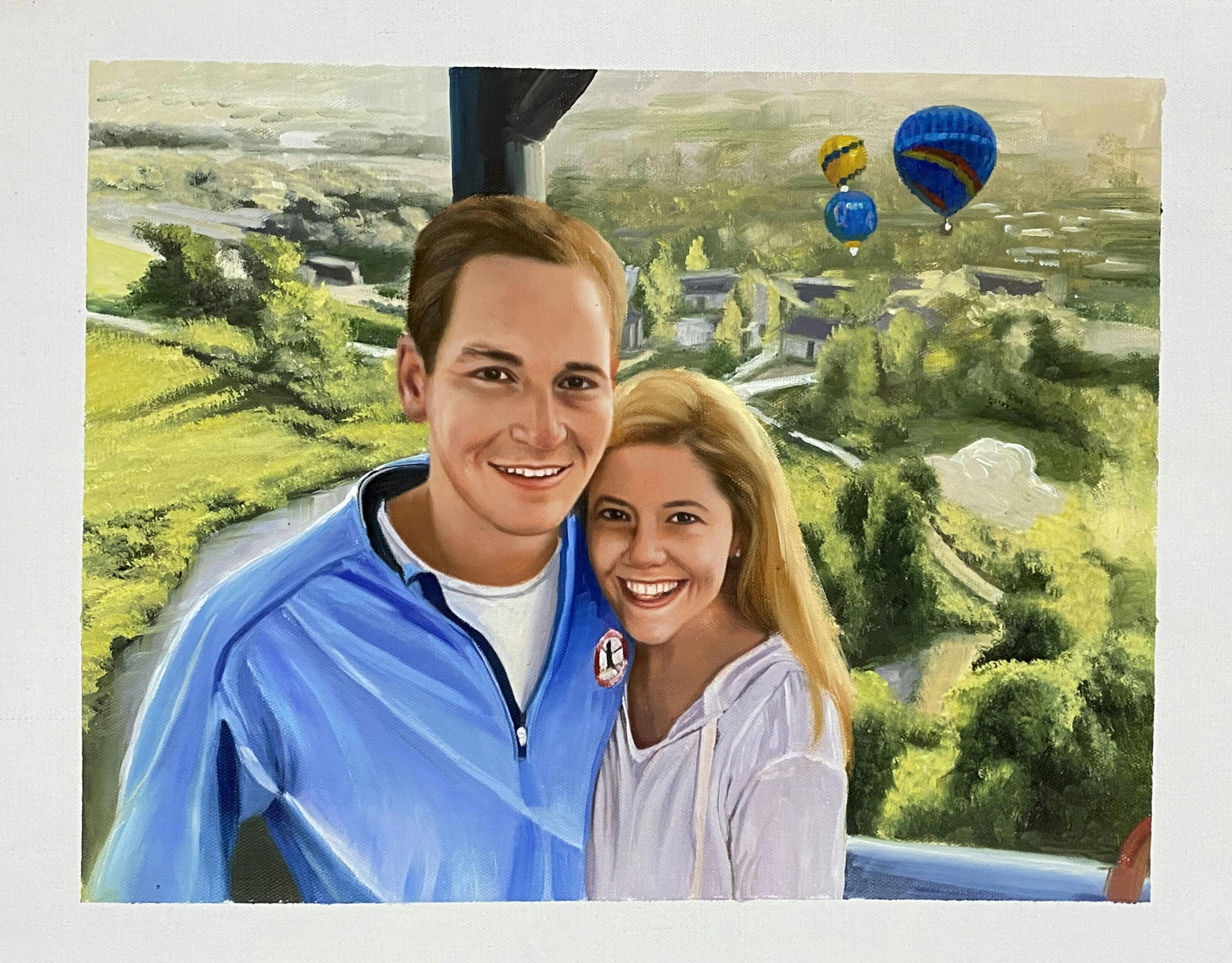 This is a picture of us on a hot air balloon. There were other hot air balloons flying near us in the picture. Please feel free to make the background look as though there are other hot air balloons in the distance.