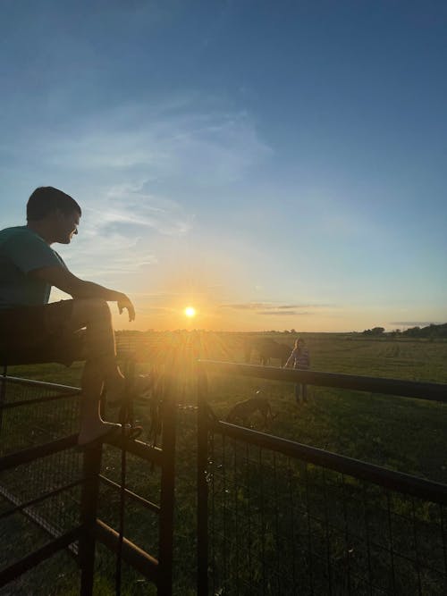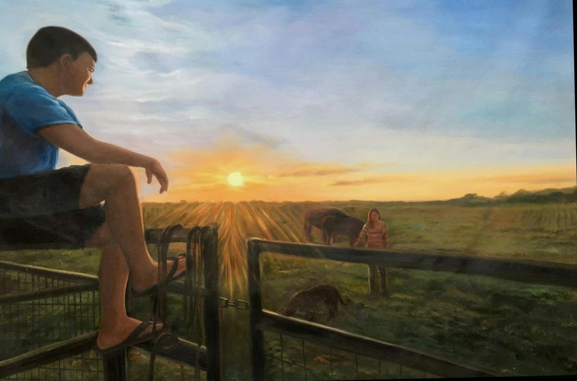 The main photo I wanted painted is the one of the man on the fence overlooking the field with the sun setting. If possible I’d like the woman, horses, and dog to all be more visible in the background and brought closer to the front so they can be seen more clearly. I’ve provided other references photos for the horses and dog as well.
