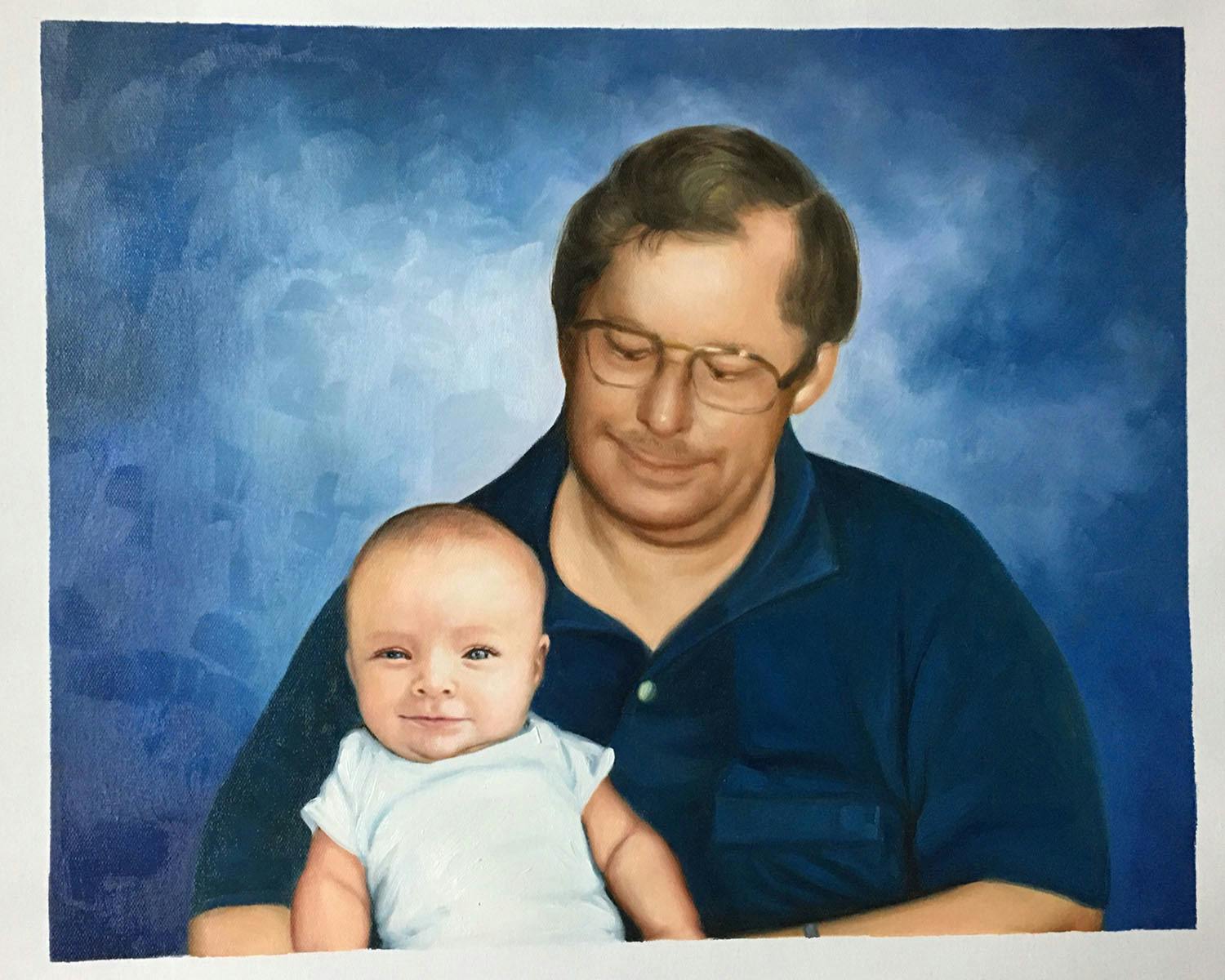 Hello! I would like to have my daughter painted in a picture with my grandfather. As him looking down at her smiling, with his side profile & her looking up at him smiling.
