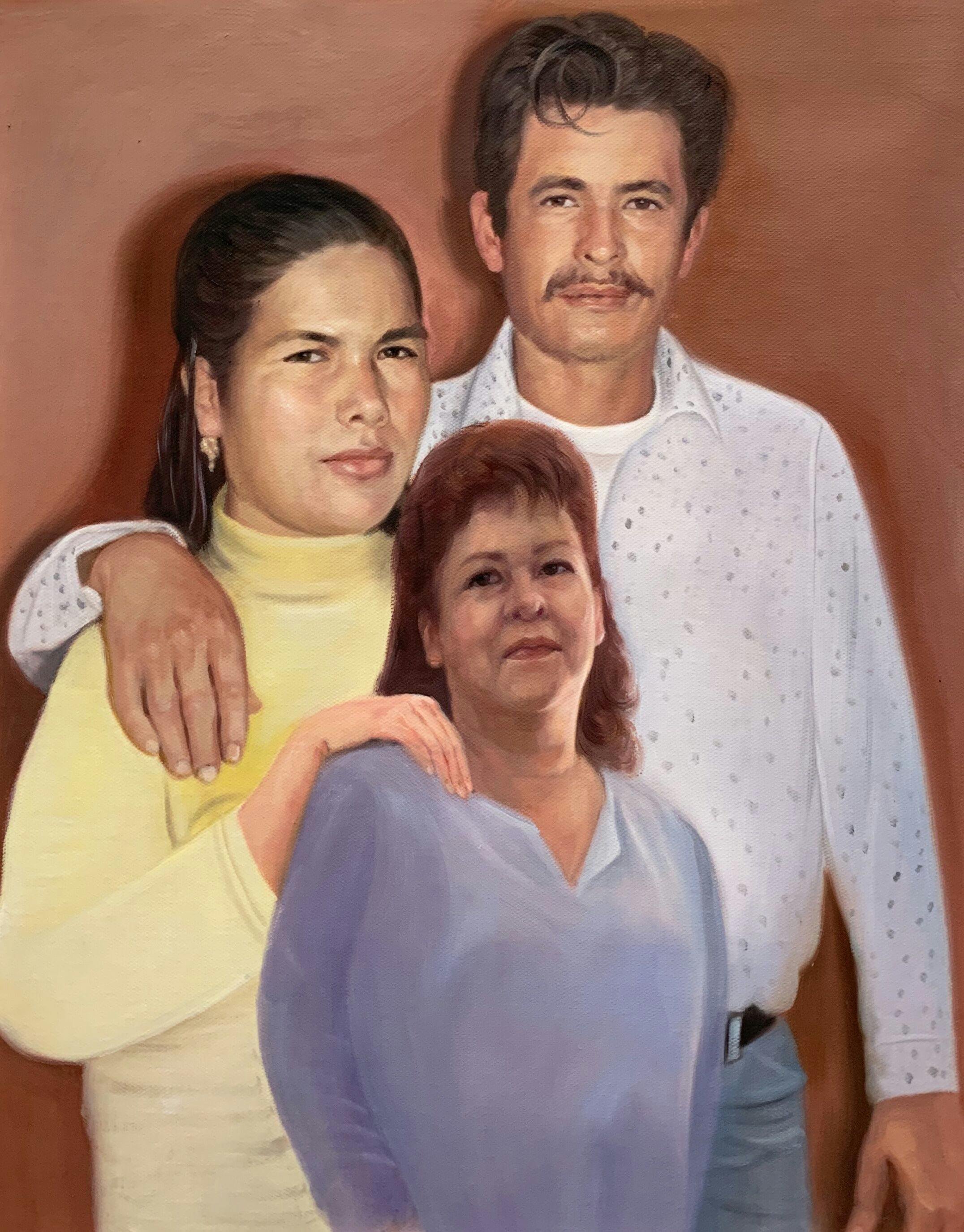 can i please have the 2 people from first photo painted without the baby please! and when you paint the 2 people from first photo please put the lady from second photo maybe between them please! the overall portrait will be my mother with her parents