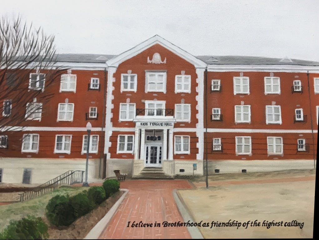 The name of the Residence Hall is Kate Teague Hall. Also the vertical sign behind the bench can be removed from the painting. Also can a matt finish be around the painting with the following quote as well. "I believe in Brotherhood as friendship of the highest calling"