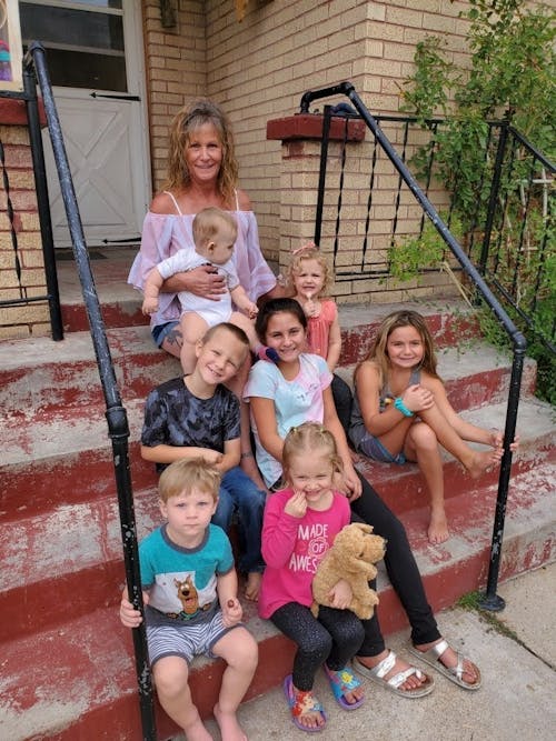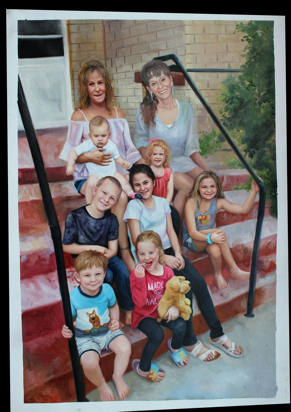 We want a painting just like the first picture on the steps, but adding the lady in the third picture in next to the woman in the back. She passed away after her first great grandchild was born, so she's never met most of them. Pictures of her are far and few between. I hope this picture is enough reference for you. Can you give her a body so she is sitting there realistically next to the other woman? I'm hoping we can scoot the woman who is already in the picture to the left enough so they both fit there nicely. I included 2 different pictures on the front steps so you can combine them to have all the kids smiling in the final painting. I hope this is enough instructions. Please let me know if you need more! We really want to give this to her as a Christmas present, as she has had a really hard year!