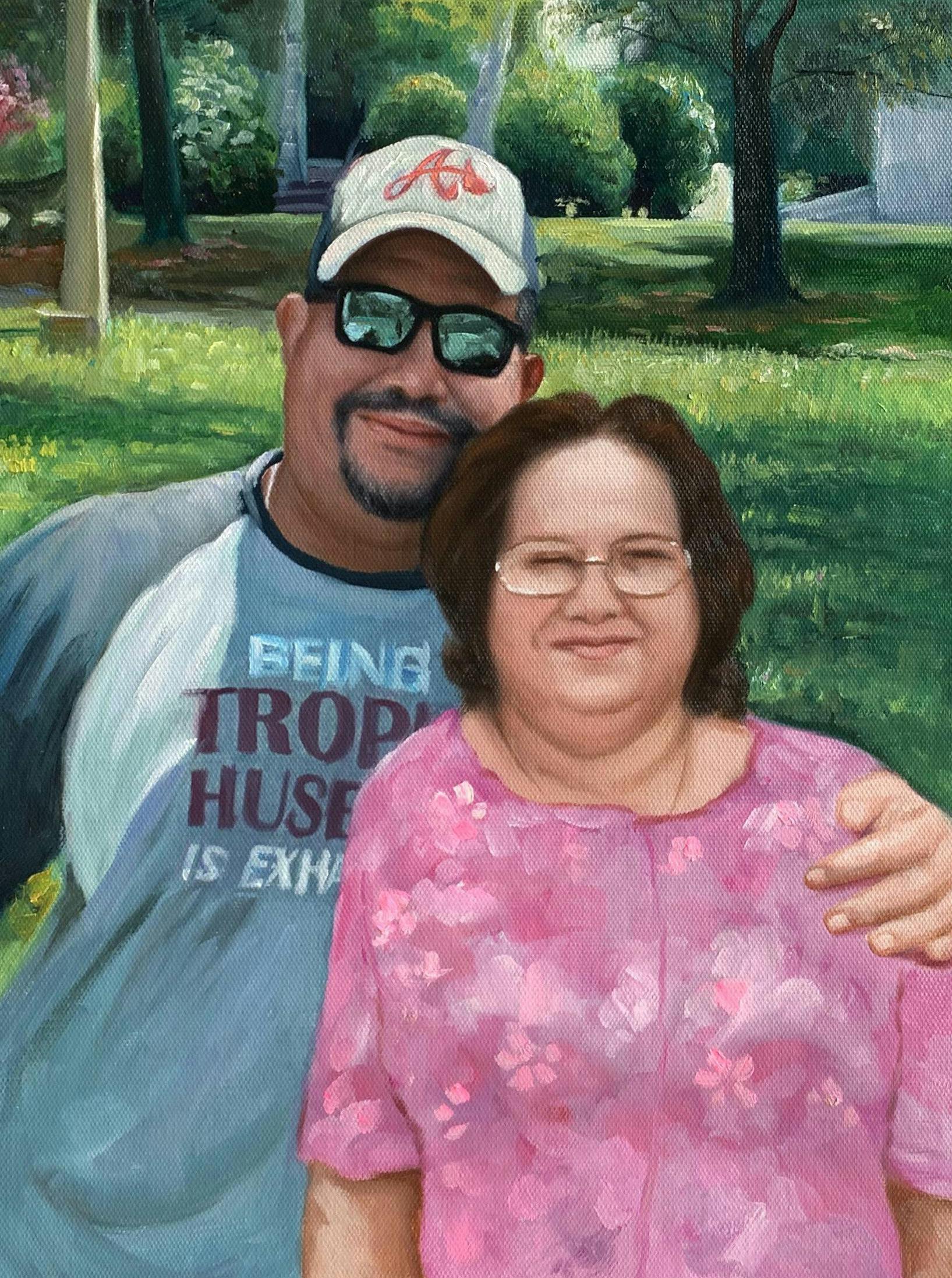 I want the lady in the pink dress to be merged into the picture with the man wearing the hat. I would like for his arm to be around her shoulders if possible. I do NOT want the purse in the woman’s hand. I do NOT want the words printed in the man’s shirt. I want him to be painted in a solid color shirt. The artist can pick the background color that he/she feels is best. The artist can also choose which color to paint their clothing. I would like this painted in portrait orientation. Please send me a proof or sample of the painting sketched or digitally merged into one image before starting the actual painting. Thank you so much!