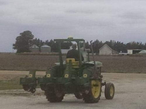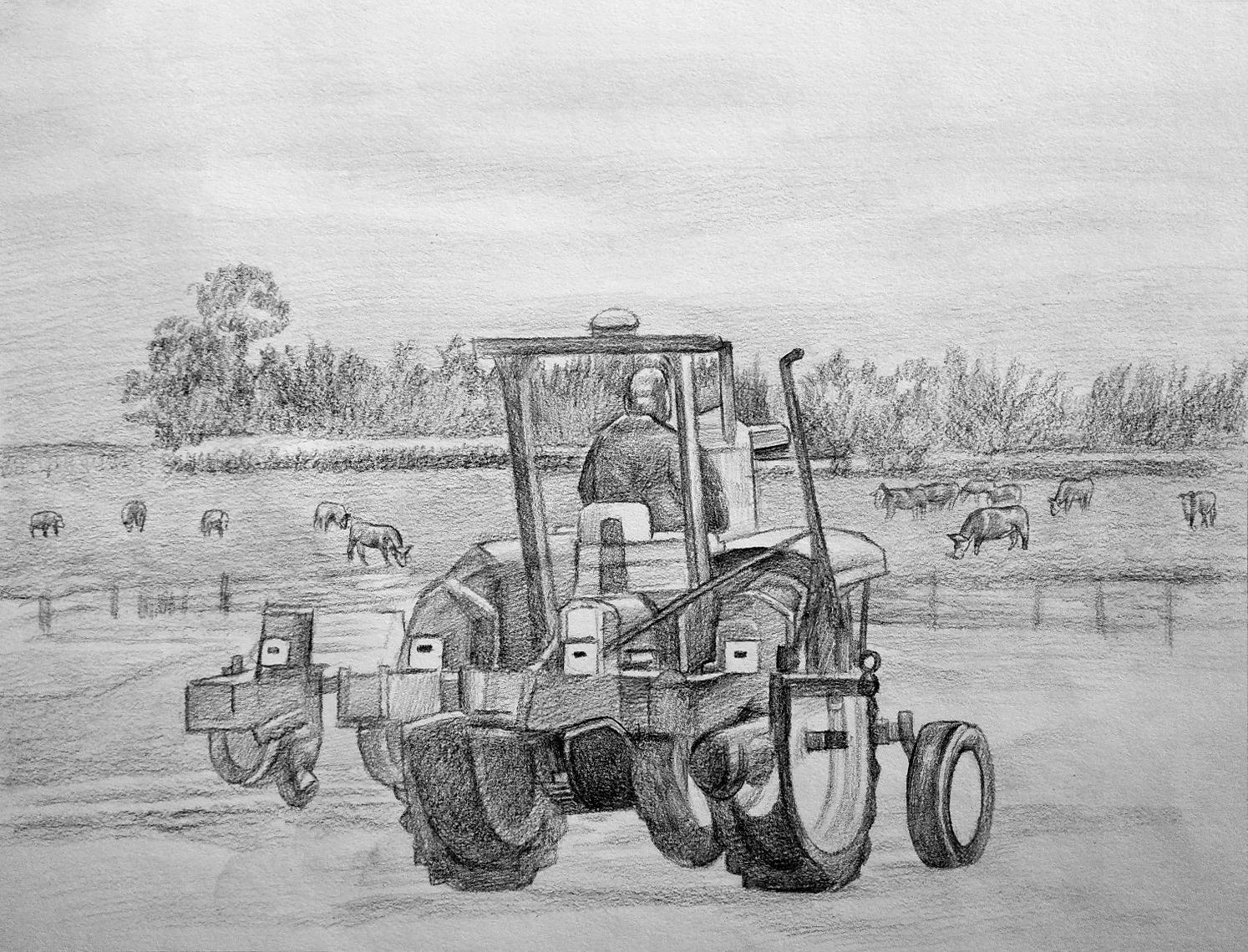 I would like the picture of my husband on the tractor and planter in a field planting with trees, cows and an old barbwire and wooden fence post in a pasture. Make sure the planter is down on top the dirt!