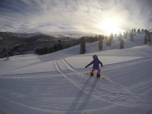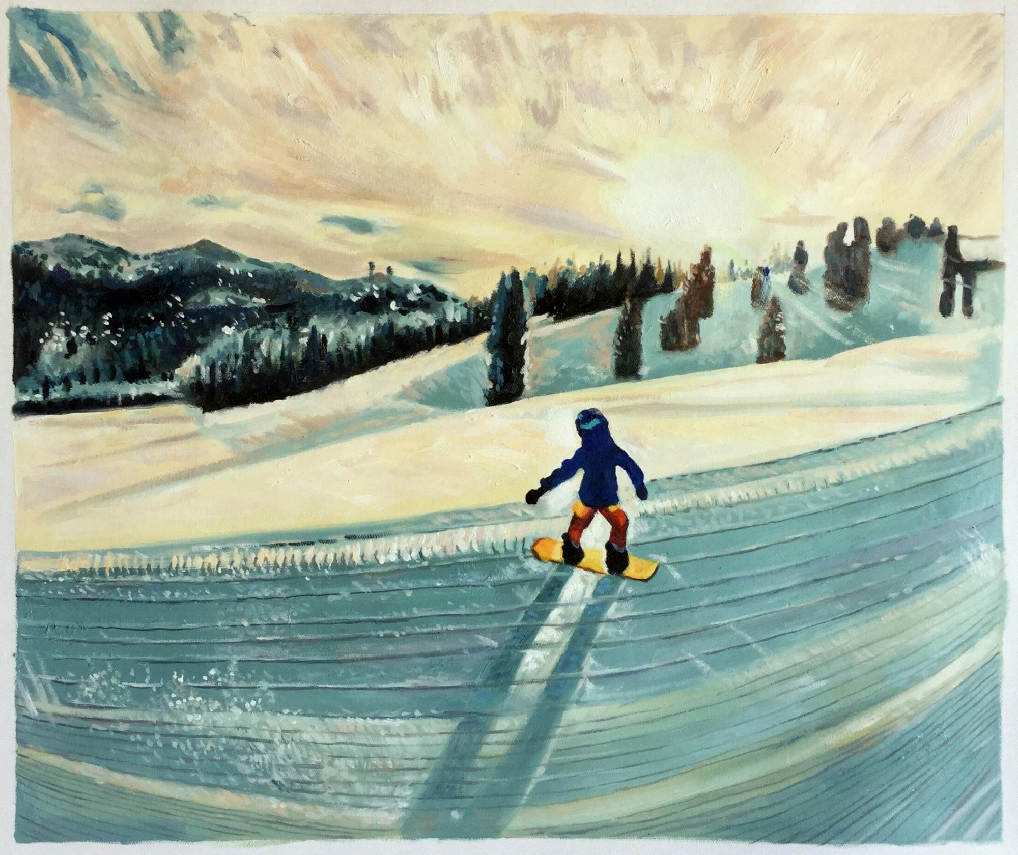 There is a set of ski tracks that begins in the lower right corner of the image and extends ahead of the snowboarder into the snow in the center left of the image. If it is possible to eliminate those tracks, please do so. Thank you!