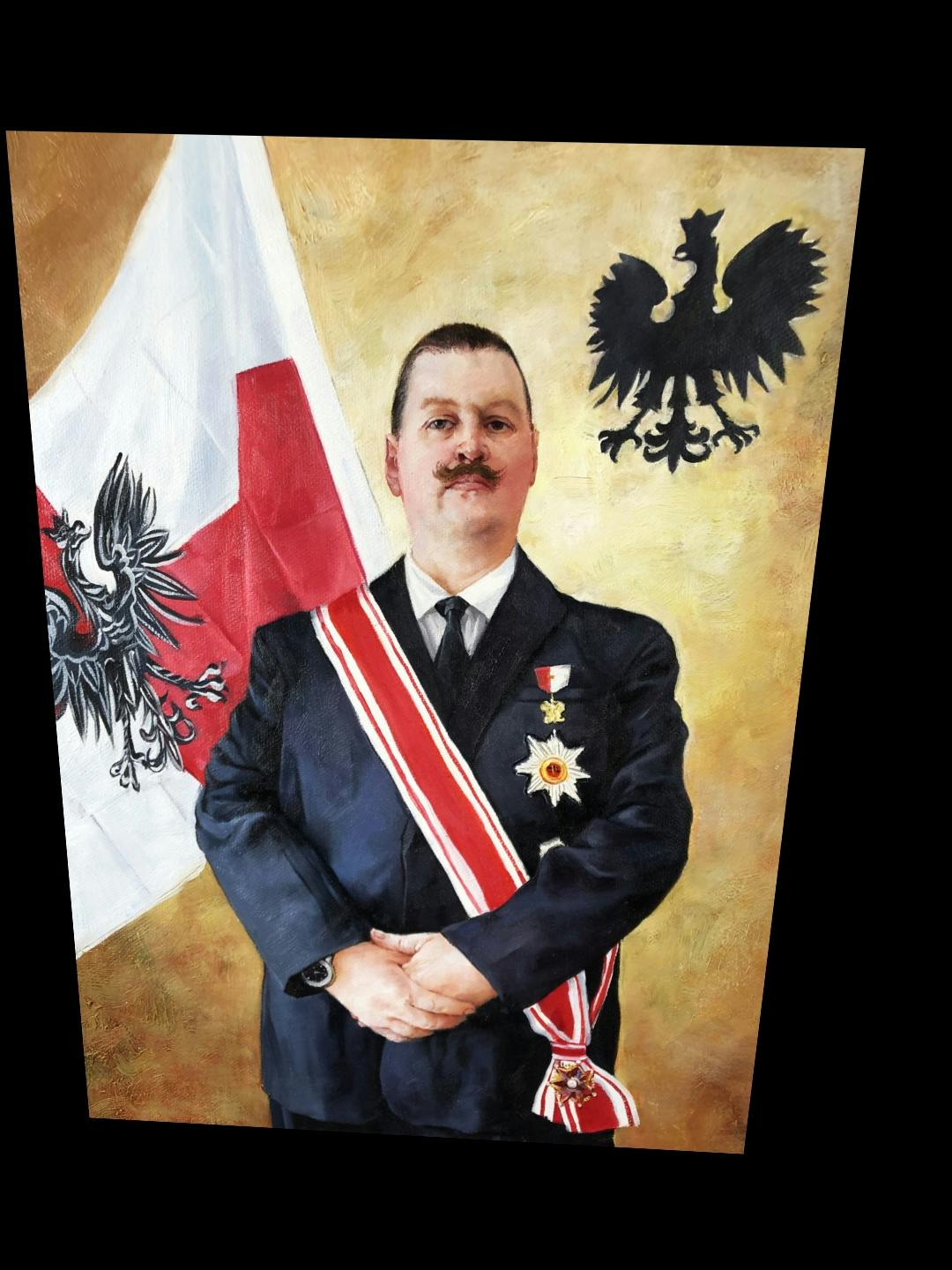 02/10/2021I would like portrait with flag and eagle in the background. Please even out the mustache, allow the sash to sit evenly over the shoulder (vs against the neck) and remove wrinkles in the shoulder area of the suit. The eagle can be closer to the subject to accommodate a 12x16 portrait. Background color may be different but conservative in nature (think royal portraits). Many thanks!