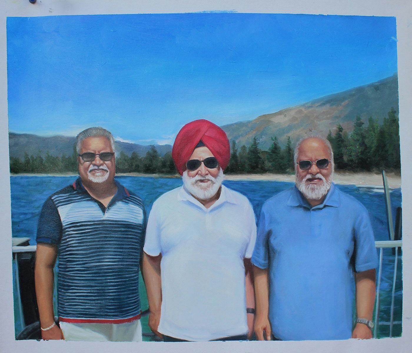 Hi! Please paint it as photoreailstic as possible. with these additions: - Make the 3 men just a little bit slimmer. basically not as big as of a belly for the 2 men on the right lol. Also if you can make them all slightly smiling. -The building on the right side is under construction. Can you make it appear as a finished building? Thanks!