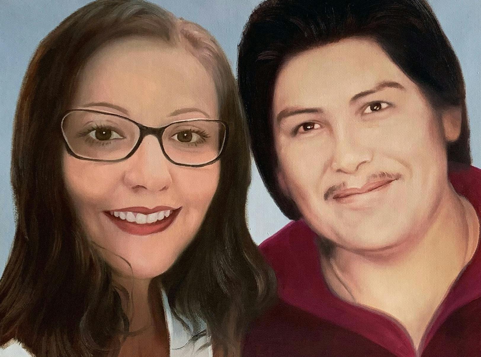 In the painting, I would just like the man and the lady with the glasses, not the other 2 people. The background can just be a solid color like a light blue.