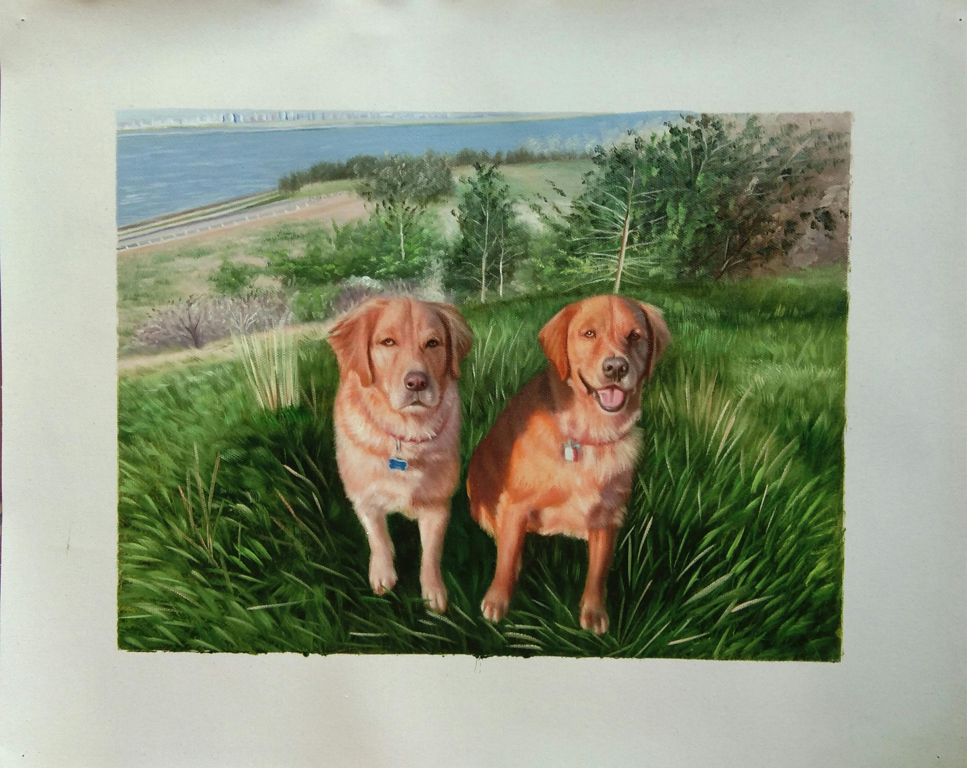 11/10/2022Photo number one use the two dogs as models for painting. Apply photo number two with the hill overlook as background