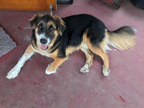 I would like the painting to look pretty realistic, but I would actually like it to look like it's a painting and not like it's a printed photo - so being able to see just a bit of the brushwork and texture would be nice. Please make the painting in a landscape orientation (wider than tall) and replace the background with some sort of lush natural green/meadow/forest-y setting on a bright, sunny day - I don't want Scout to be on a wood floor or for any other man-made object to show up. Please make the location similar to the one you use for Echo's painting, as if they are in the same area together. Thank you!