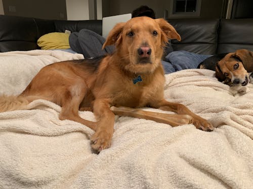 Please use the two pictures of Lucy and Theo, and put them together in one portrait, so they are sitting together. Don't include the person in the background. We just want the dogs! Please put the bigger dog (Lucy) on the left and smaller dog (Theo) on the right, slightly in front of Lucy, so his head is off-centered under Lucy's chin, but not covering her name tag. Please don't paint the bone in front of Lucy - that's where Theo will be sitting in the painting, so you can leave that dog bone off. Can you also paint it so their names are on their dog tags? Lucy's dog tag is faded (the top left part above the L and U. Can you please not paint it faded, but paint it blue like the rest of the tag, with her name visible? Theo has a red dog tag, but his name doesn't show. Can you paint it so it says Theo on his tag? Please make the background neutral (cream colored, perhaps? Or grayish? Or both?) so it's just the portrait of the dogs with a soft portrait background. I'm ordering 16x20; please orient the portrait so it's landscape (20x16) so it can fit both dogs' bodies, not just their faces. Thank you!