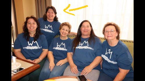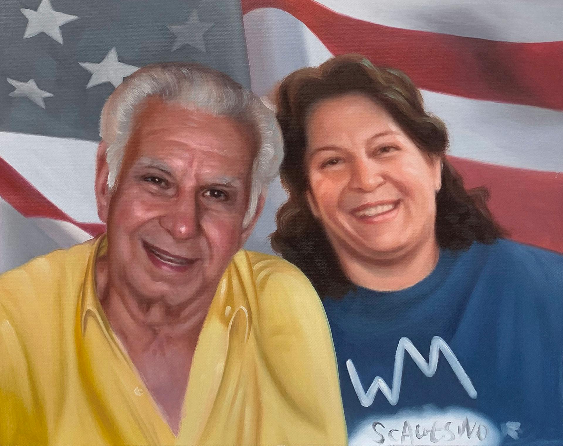 Please paint my grandfather in the yellow shirt and replace my grandmother with my mother ( the woman in the second picture with the yellow arrow pointed at her). My mothers hand can be on my grandfathers shoulder like my grandmothers is. Add background as the faded flying American flag like reference photo. Please make it 100% realistic! Can I please view the artwork before it is painted? Thank you so much