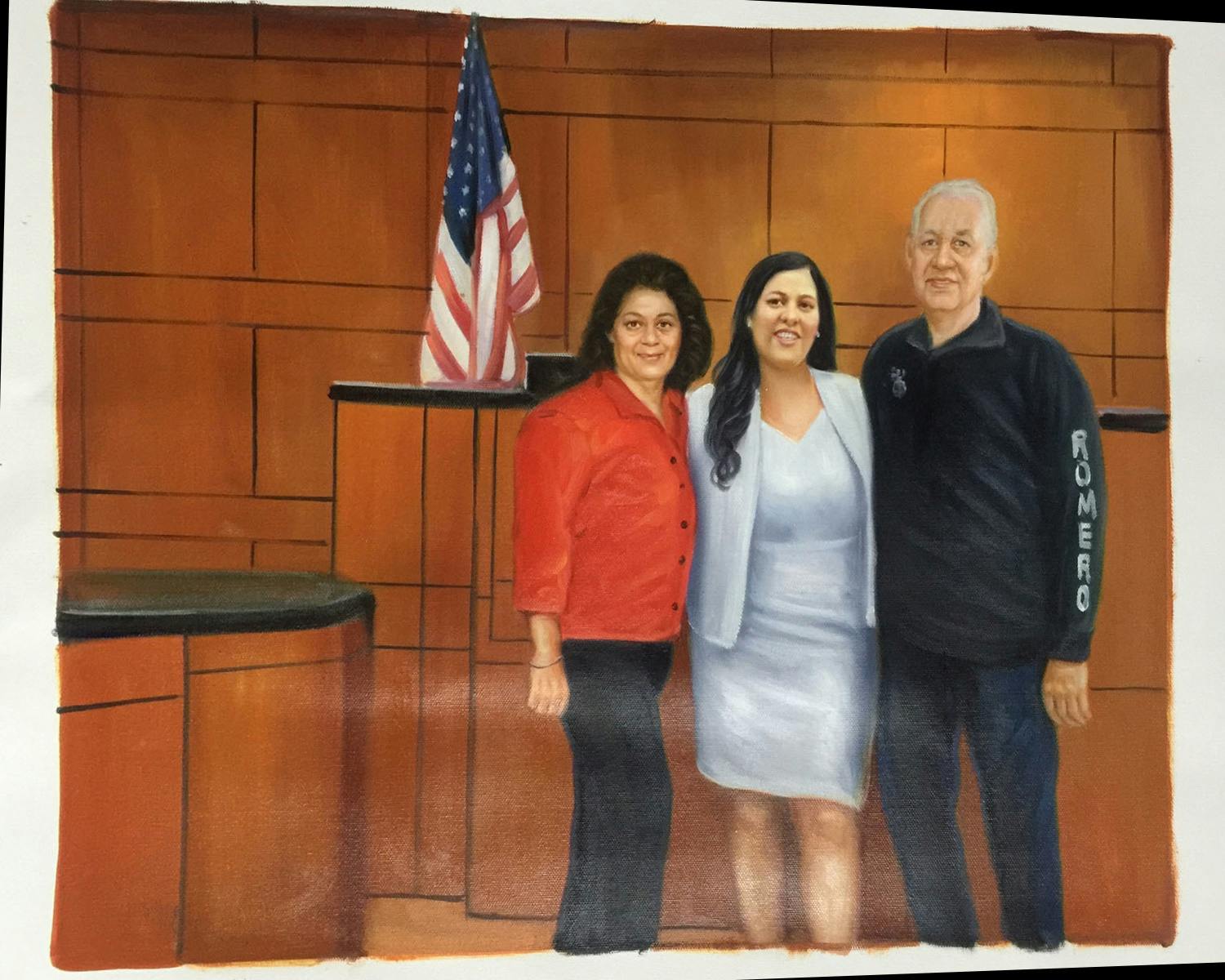 I would like a realistic oil painting replica of the submitted picture (Main Reference Photo) with the left and right individuals replaced by my grandfather and grandmother. Pictures for my grandmother: (Grandmother 1,2,3,4) and grandfather (Grandfather 1,2,3,4). Please keep the background in the Main Reference Photo exactly the same with all proportions. Ideally, please place my grandmother on the left, keep mother (center in the Main Ref Photo) center, and grandfather right. Thank you for your patience in advance!