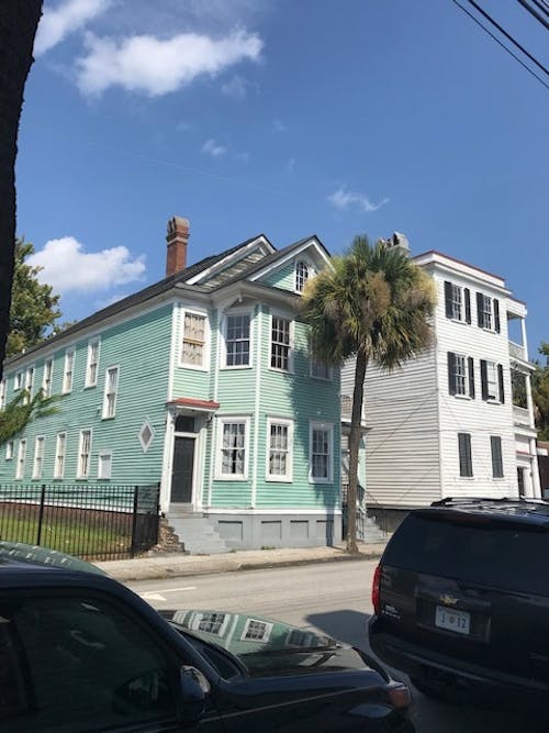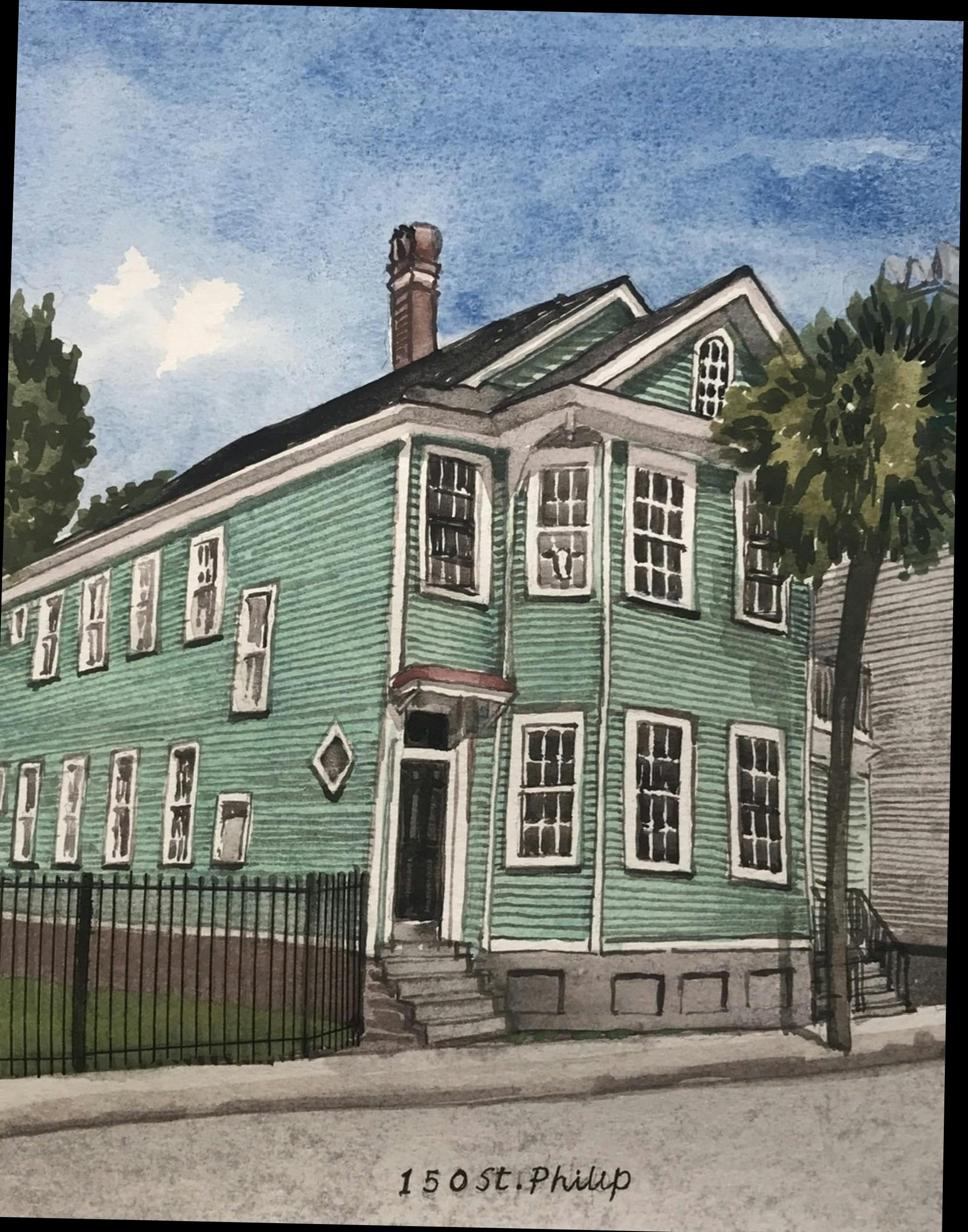 I would like a realistically styled watercolor that is a blend of the 2 angles shown in the 2 pictures. (let me know if you did not receive 2 pictures uploaded). Do not include the cars shown in the 2nd picture. If possible I would like the address written in the center on the bottom in script: 150 St Philip Street