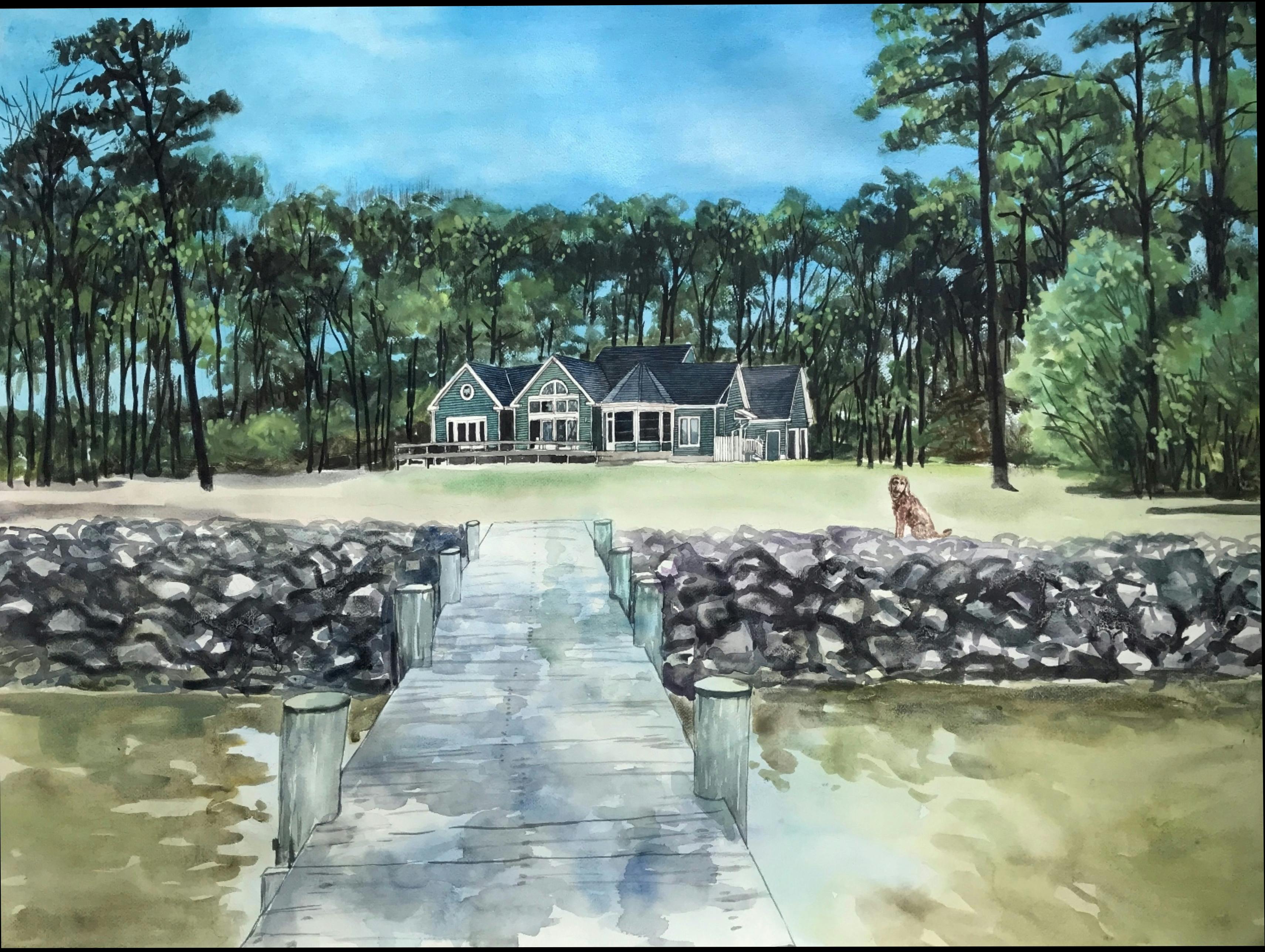 Use this as the primary reference: IMG_7097.jpeg Want the house, dock and water in the photo. Could you remove the two trees that are in the middle of the photo and make the house a big bigger in perspective (the main focal point should be the house) and put the dog very very small somewhere around the house. Can send more photos or give feedback.