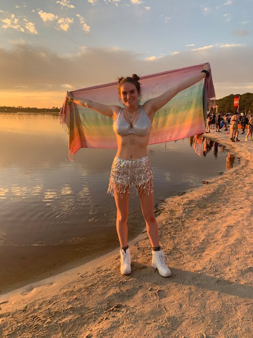 The photo I want of my girlfriend is the one where she is standing by the beach holding her rainbow blanket up. I want to remove the people in the background of the photo and hoped you could lighten up the photo. I was also hoping you could make the painting more colorful in general...she loves psychedelic things so maybe keep the beach but incorporate some more colors and trippy things into the painting. I also was hoping you could paint a little halo above her. Also, I included a reference picture to show you her actual skin color as she looks much darker in the photo I want painted. She is the girl on the right in the reference photo. Please call or email me if you have ANY questions. I was also hoping you could draw a small little heart somewhere on the painting with our initials (J + M) inside of it. Thank you!!
