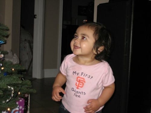 Add more Xmas tree to fill more space between tree and girl. Take out red eye. Add girls name, Aleah, age 2 Add girls name, Aleah, age