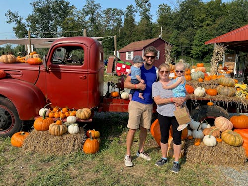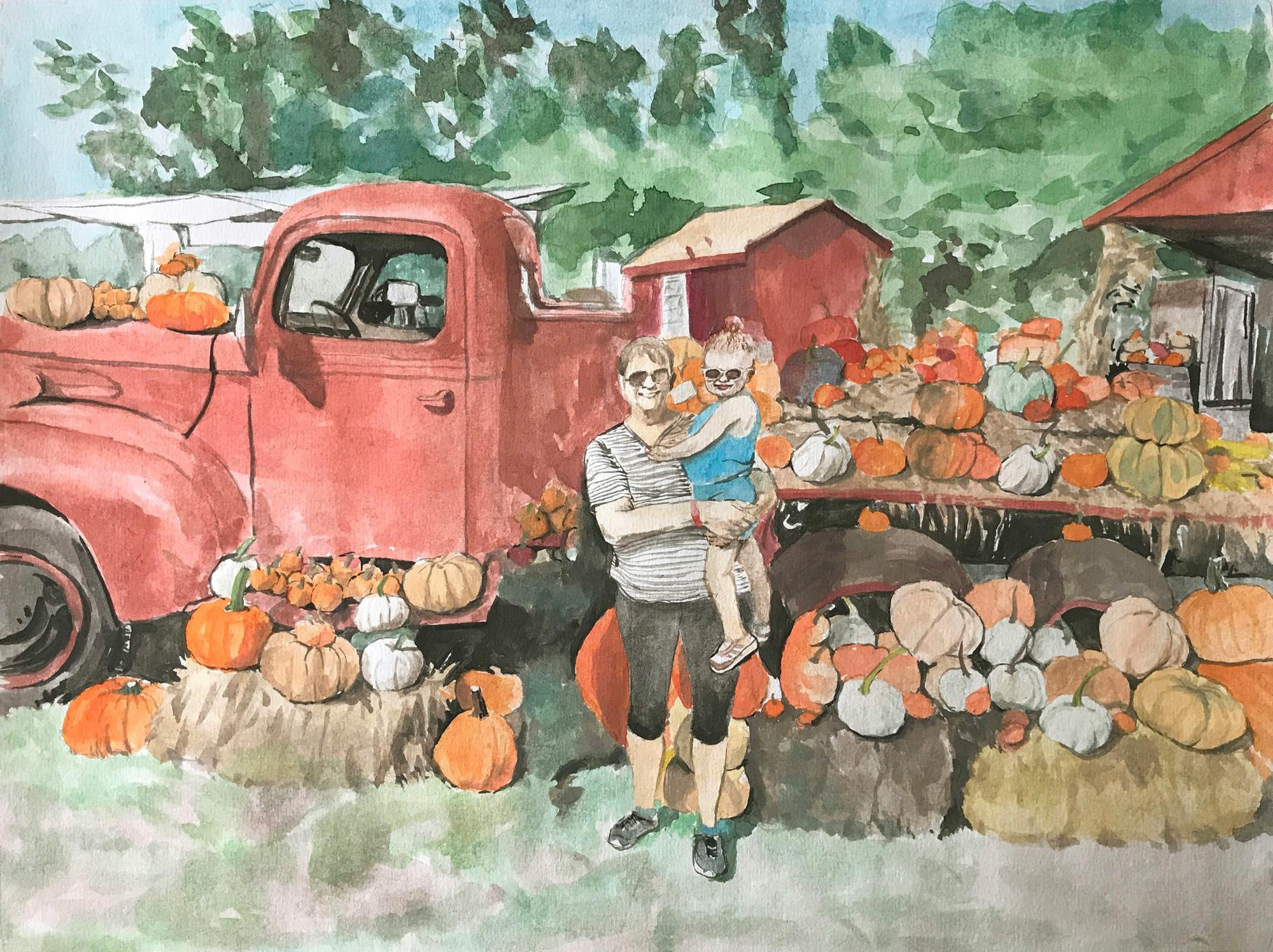 Could you please remove the man holding the baby? Also the filter I chose in the artistic style has a very yellowish hue. Could you please make the colors in the watercolor more realistic like the photo? lastly if you could make the background behind the truck look more picturesque? for example there are large telephone poles and a large wooden apple that could be removed. Thanks!