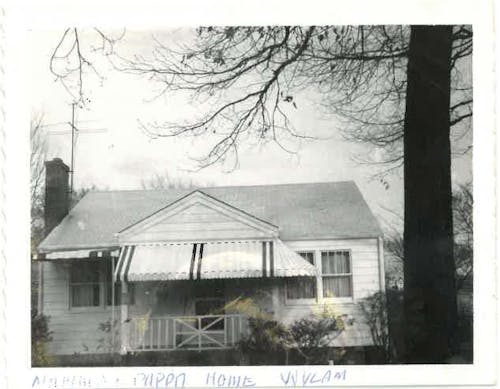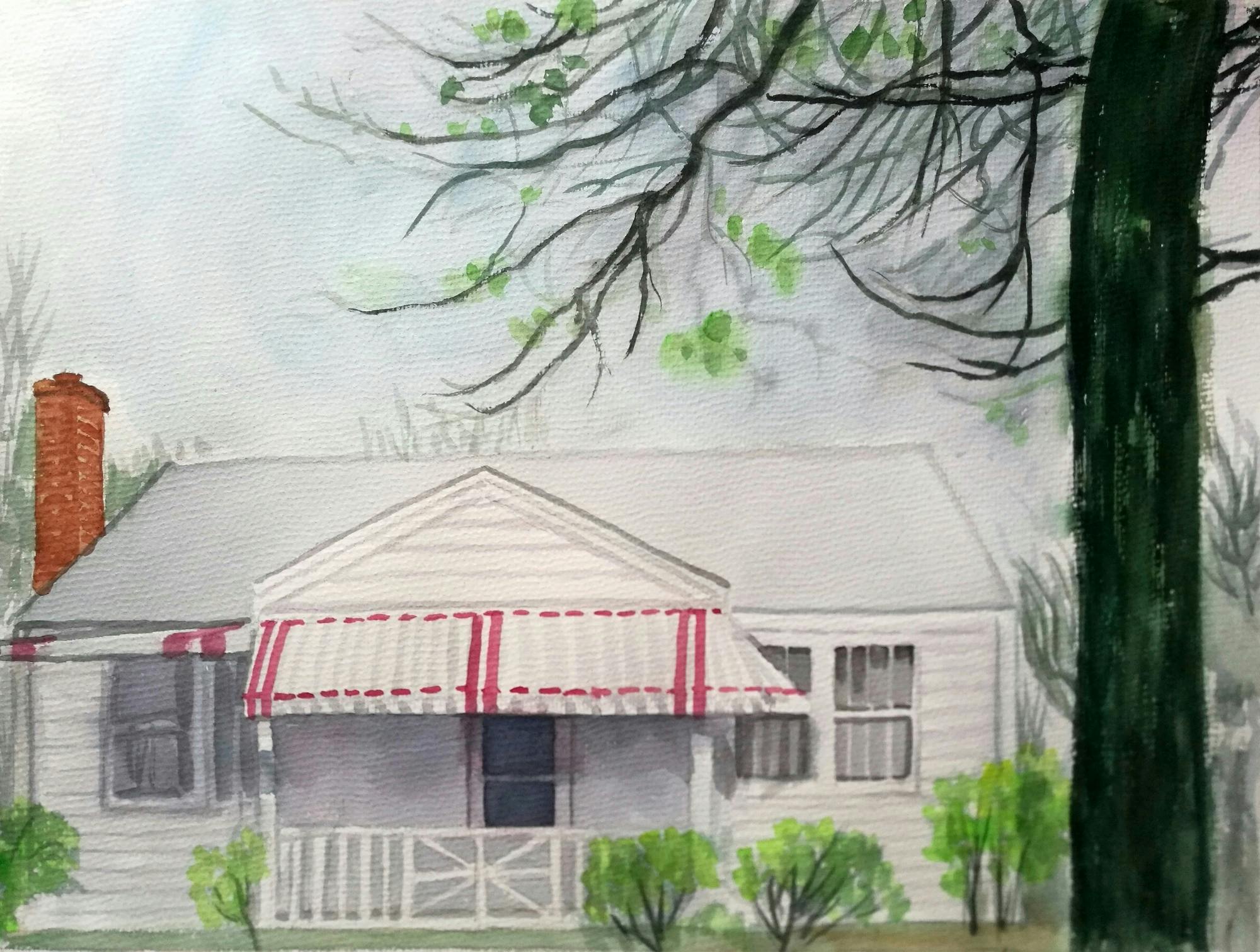 The house awning had dark red strips so the black you see was red. The base of front porch and left side porch were painted dark red like the awning strips. roof was gray. chimney was dark dark redish brown brick. can you make sky blue and cloudy. i guess colorize the whole photo. remove ink writing on photo