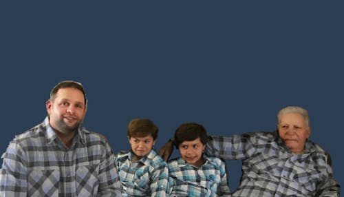 Please try to paint grandpa(right) closer to child and more straight posture if possible. Please also feel free to add a suitable background maybe sitting outside with trees and lilacs bushes. (Originally,They were sitting on an old couch but I cropped it out). Also, please Paint as realistic as possible.