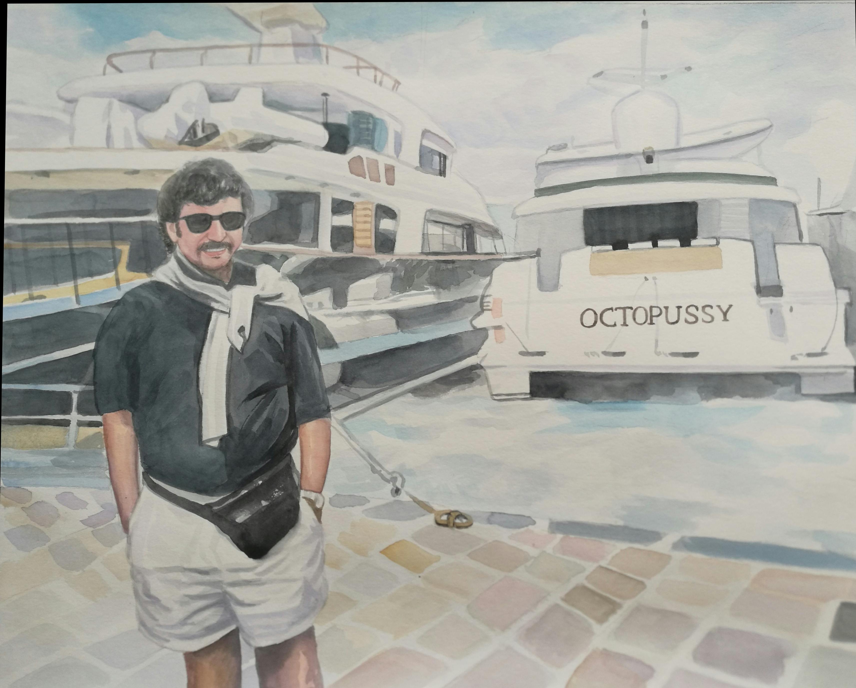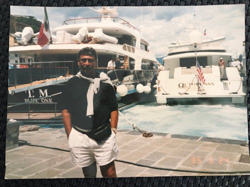 Please remove the background people on the boats, remove the flags from the boats and remove the hanging white balls from the big boat. Please include the names listed on each boat. The person on the dock is the main focal point of this photo, but we would like to have the background as is, with those minor adjustments listed above.