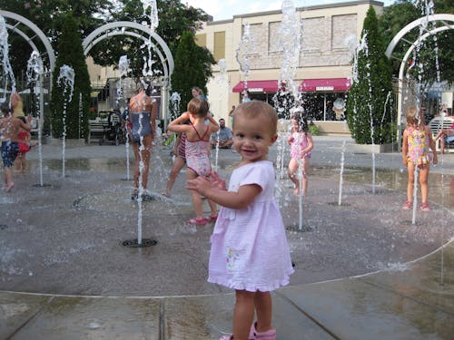 I want an oil painting like the one in the LizzieatStonyPoint.jpg, which is a picture of her oil painting, but I want it to be of the child (Molly) in the MollyatStonyPoint.jpg. I do not want the other children to be in the portrait, and I would like the water to shoot up around Molly like it is in Lizzie's picture. These are sisters wearing exactly the same dress 3 years apart so I want Molly's background to be similar to the one in Lizzie's oil painting.
