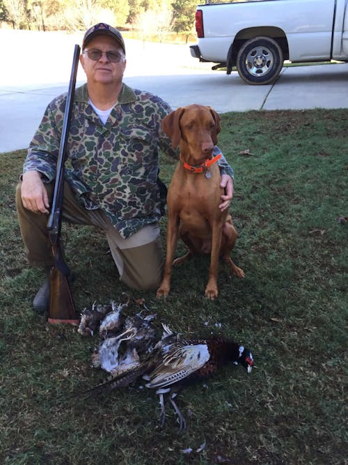 The photo with the black shirt and bushes in the background is reference photo #1 and the photo with the white truck in the background is reference photo #2. I like everything about #1 except the face of the man. I want the face on #2 put onto photo #1. I'd like the tint on the glasses to be lighter the man's eyes are blue. Keep the hat the orange but make it a more uniform orange color. I want Joy Chen to paint this if possible.