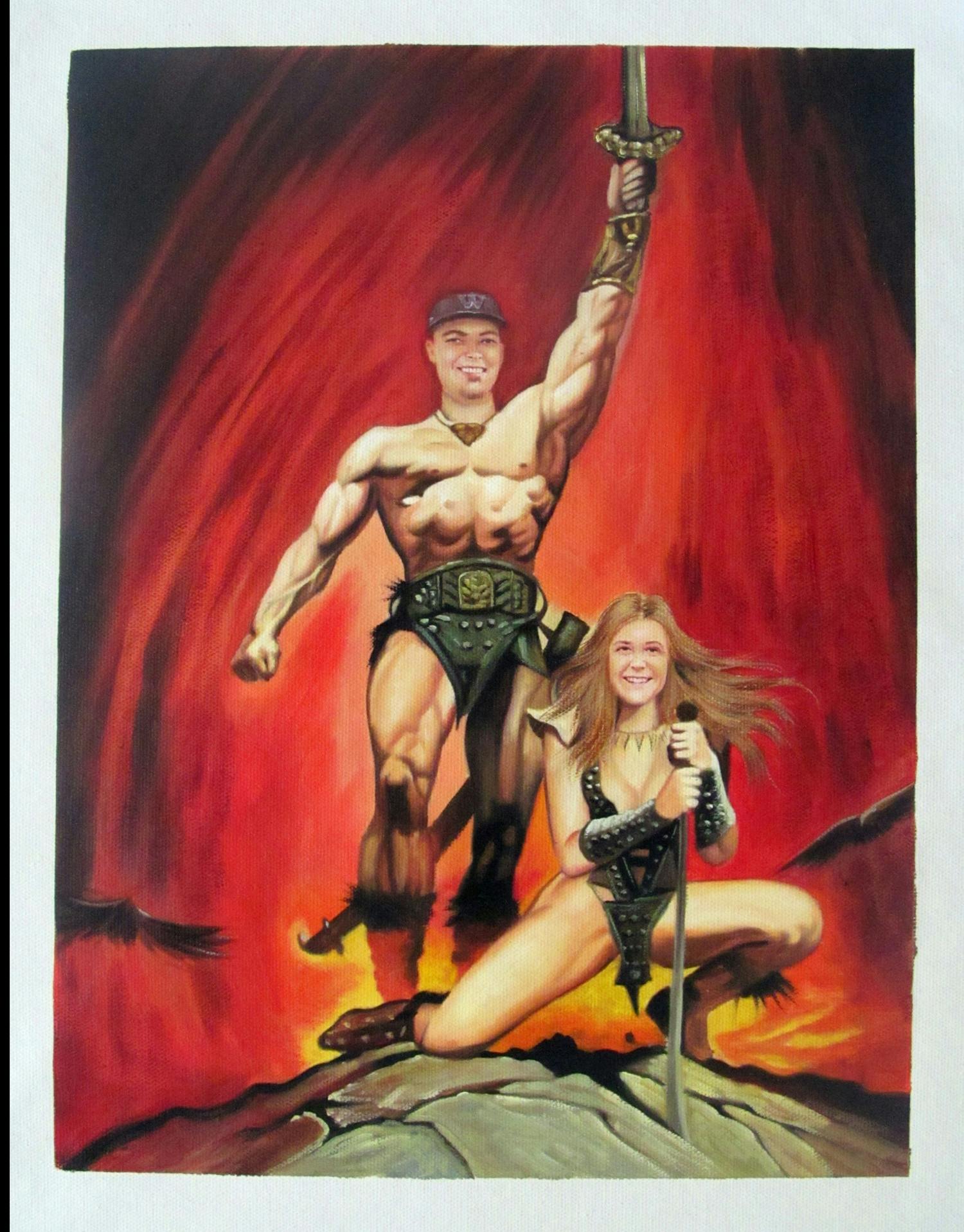 09/04/20212 pics - one is my brother and his wife. I would like my brother and his wife on the barbarians - from the neck up. Slim up the features slightly - its not realistic, but its even less if my brothers chubby face is on Conan's body. So make it match. Thank you!