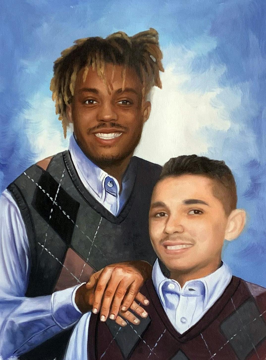 02/04/2021Can you pick a plain background and just paint my husband setting in front with a black tee shirt on and juice wrld standing behind him with a hand on his shoulder smiling. Thank you! Also an example of how they’re standing would be the cover of the movie step brothers