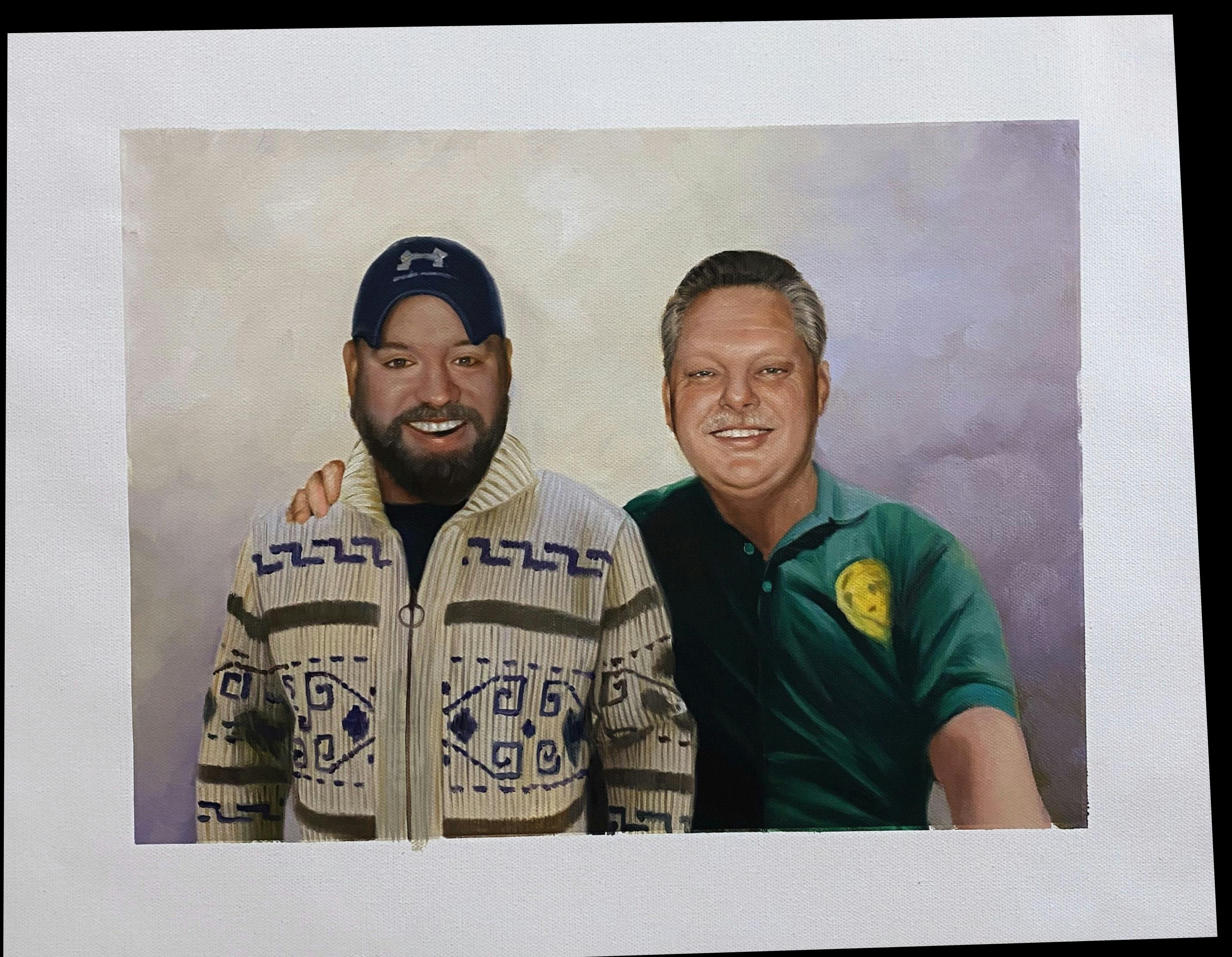 The older man in the uniform is my buddy's (younger man) father who passed away years ago. He doesn't have any photos of himself as an adult with his father. Please paint the two of them with the fathers arm around his son. Please paint the son as he appears with the bears in the two older versions of him. Please also paint the son in the cream colored sweater (remove bowling pin tag on zipper) please paint the father wearing a forest green Polo shirt with no undershirt. I can provide an additional photo of the father wearing that shirt if you need. I would like them both looking happy as they did in the uniform photo, and obviously both looking at the camera.