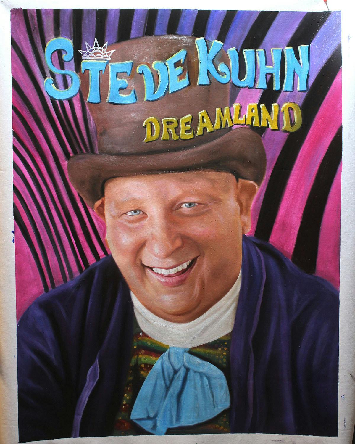 Would like painting of man in costume to look like poster - change words from what’s in poster to this: STEVE KUHN & DREAMLAND (Would love same style of type, to resemble original poster as closely as possible) thanks!!