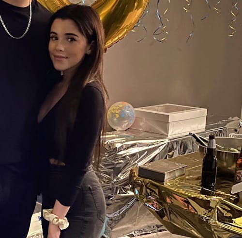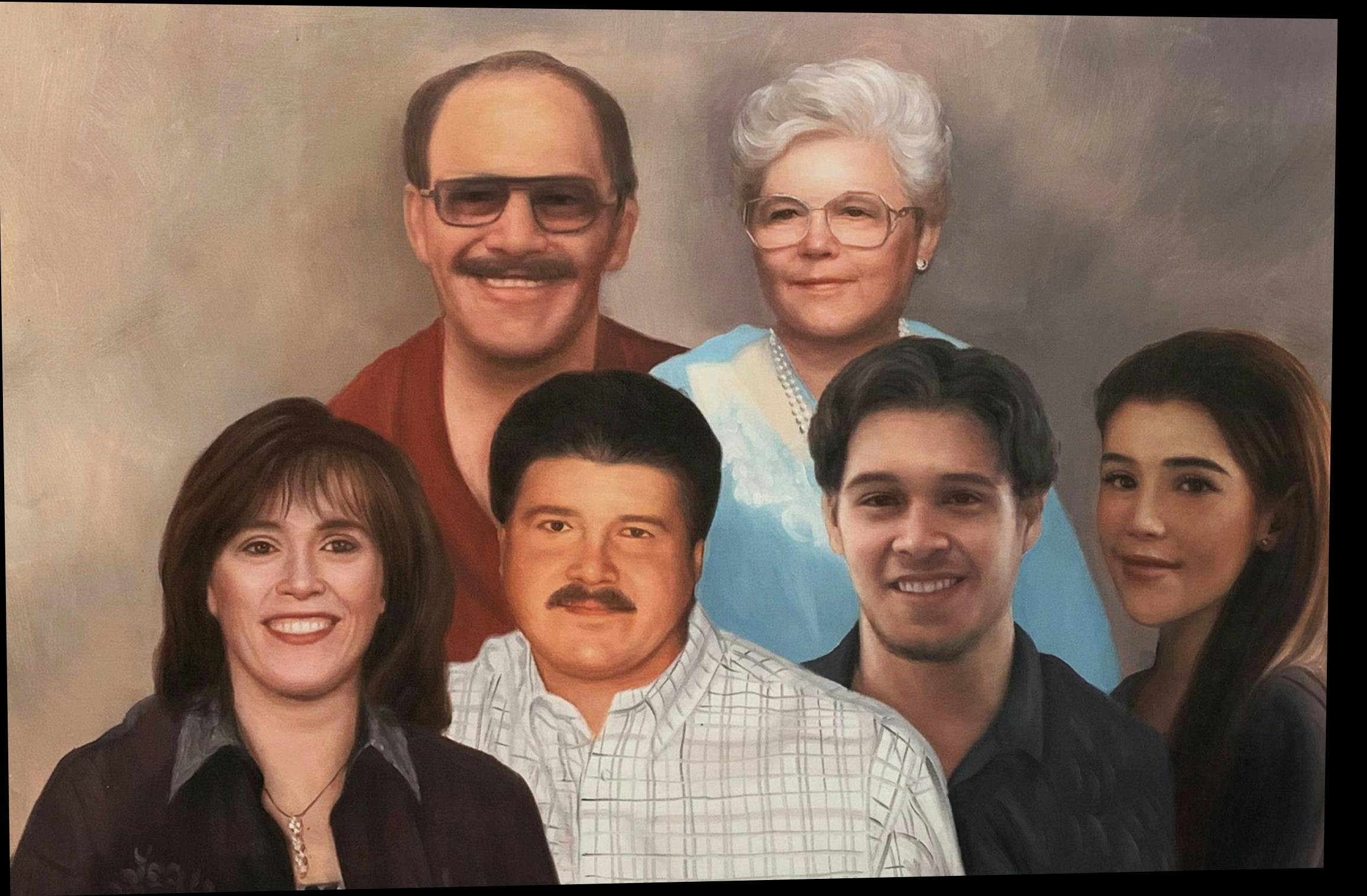 Please combine these photos with a solid colour as the background (whichever colour the artist thinks looks best.) I have a preference of where I want each person in the painting. Please put the older woman with glasses beside the older man with glasses and the other woman beside the man in the collared shirt with the mustache. Please also put the youngest guy beside the young girl.