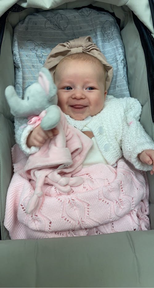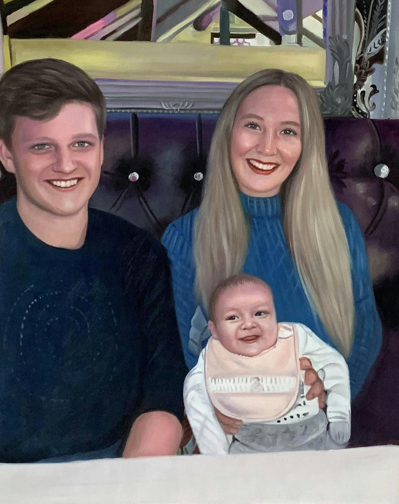 Please could you use the image of the 3 of us but paint the baby’s face with a smile- I have attached a picture of the baby smiling for reference. Could the baby also be painted sat more to the left so she looks like she’s more in the middle if possible? Doesn’t matter if that’s too complicated :)