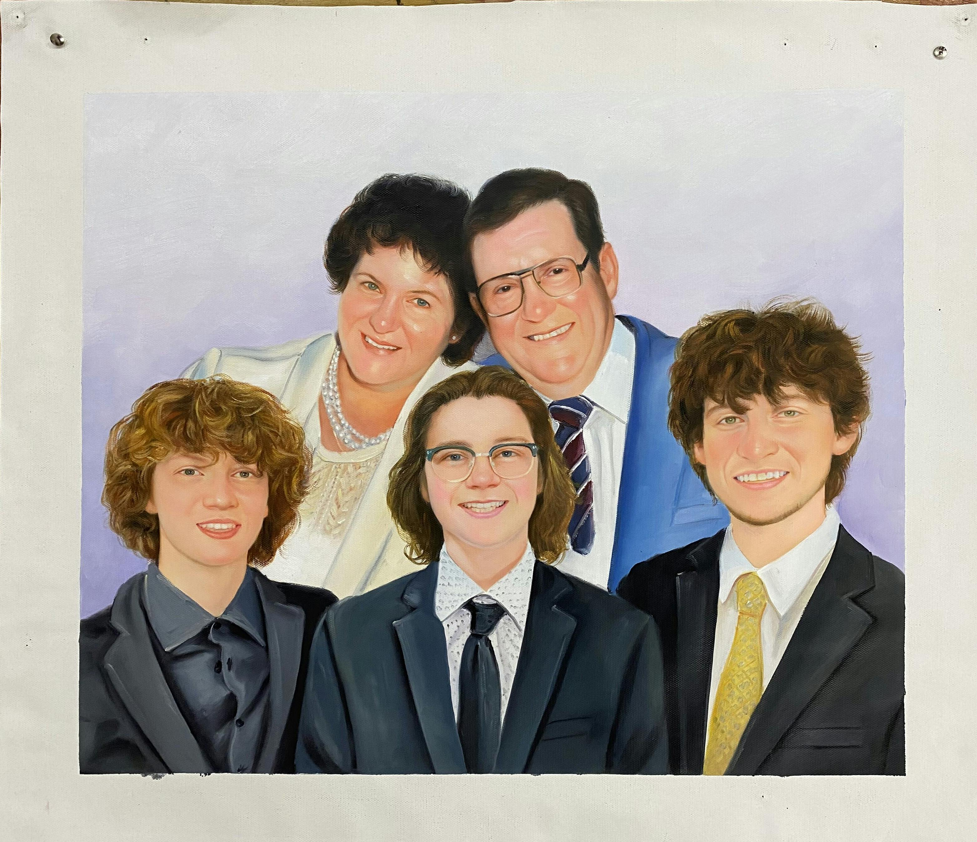 Hello. What I would like is to have one painting with the 5 subjects. The 2 grandparents (one on either side) and the 3 boys in the middle. The one boy in the middle should have a jacket - I included a photo of him in a jacket and the one boy with a black shirt if you could make that white like the others that would be great.