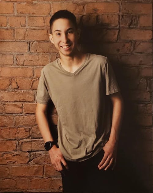 merge the 2 photos please, my brother (in the brick photo) lost his father as a baby and I would like his father to have angel wings in the back of him (his father is the one in the white shirt), you can choose the background to best fit as well. make it as realistic as possible and dont include the baby in the cropped photo. I would like his father standing on the left side of him as well with his arm behind him looking like he's posing for a photo with my brother in the brick photo.