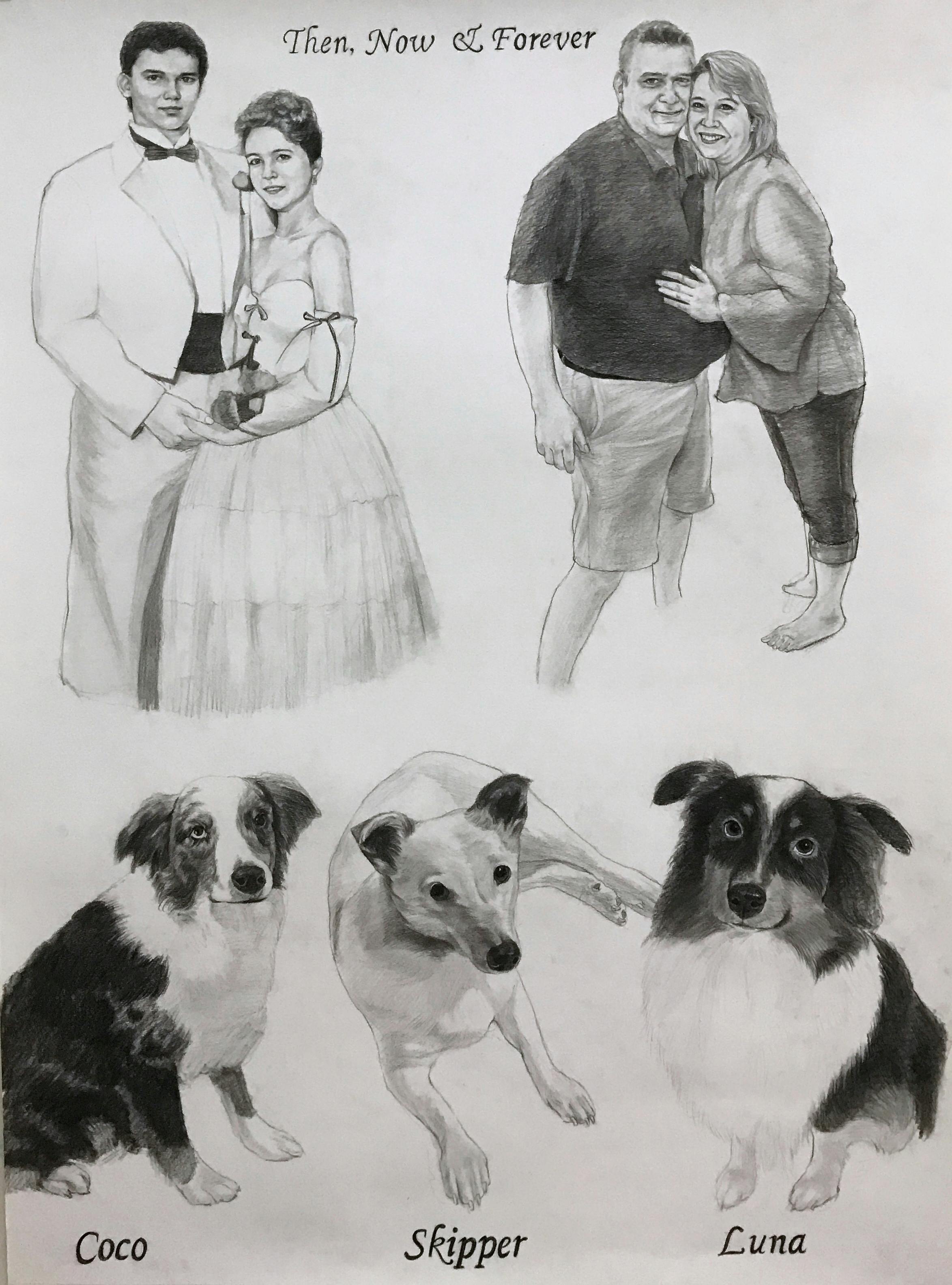 I would like the picture of us at prom with a blue background on the left upper corner, a picture of us on the beach on the upper right corner. I would like written somewhere in the middle. “ Then, Now & Forever “ Across the bottom each of the three dogs. First dog on the left will be the gray and the white one, below put her name “ Coco “. In the middle, the white dog. Below put his name“ Skipper”. On the right will be the black and white dog with her name below the picture. “Luna”. I would like this done 30 x 40 and charcoal. I would like just the dogs no background and the dogs smaller than our two pics Can the artist contact me and confirm exactly what I want done