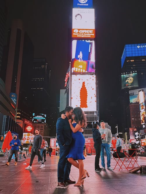 Please remove the other people in the photo from the painting (Leave only the guy in the navy suit and the girl in the blue dress as the only people) and the napkin underneath the man's shoe if you please.