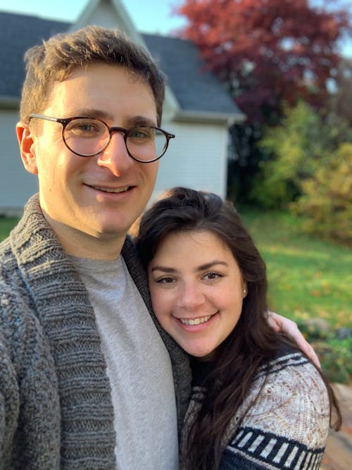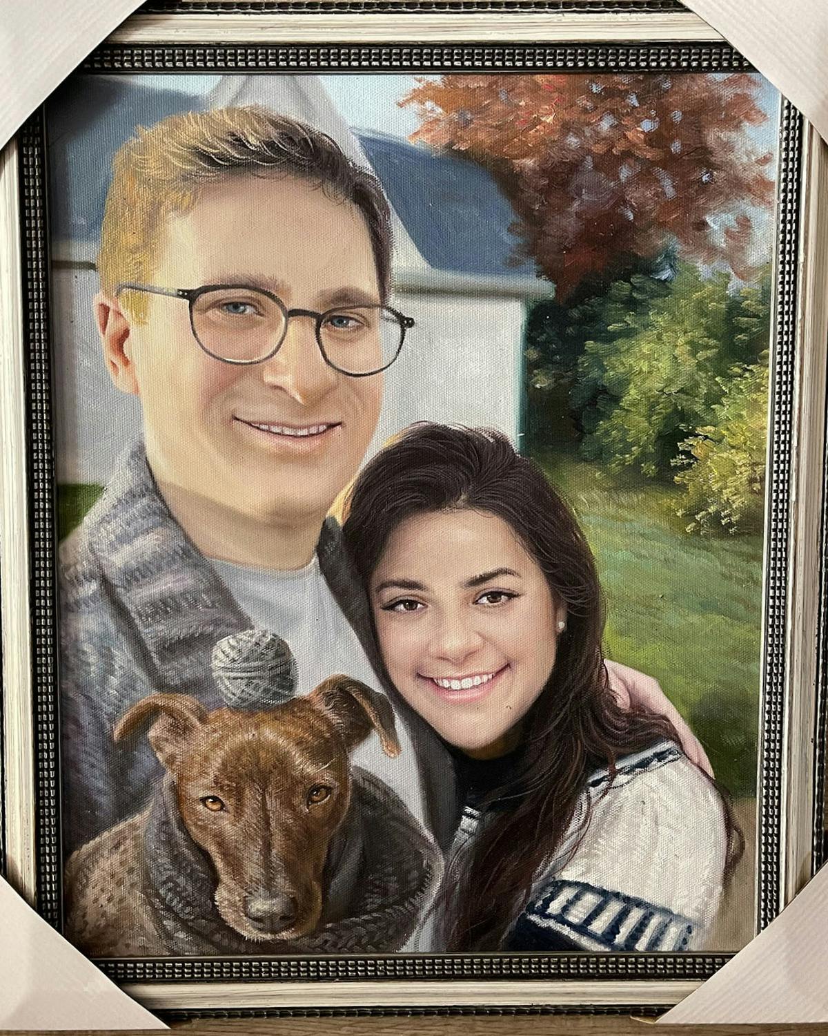 I want the main painting to be of Jake and Jess. I would like Hattie (the dog) to be perched and resting on Jess's (the shorter woman) left shoulder similar to how Hattie is lying on the red chair, but I would like the dog to be looking like at the camera too. I would also like the dog to be wearing the knit sweater from the Hattie Sweater photo, and also to have a ball of yarn on her head from the Hattie Yarn photo. The position of the dog doesn't need to be exactly like the photos, but I thought it would be most similar to the Hattie Laying Down photo - but facing the camera. I would just like the dog to look like she is naturally resting on Jess's shoulders and looking at the camera as if they all posed together - and with the knit sweater and yarn on her head. It's ok if you can only see part of the dog and sweater - whatever works best to make it look somewhat realistic.