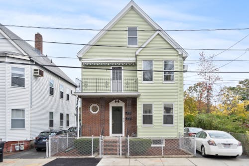 remove telephone wires, remove chain link fence, remove cars on right side, remove white house on left and cars. Remove air conditioner in top right corner of subject.
